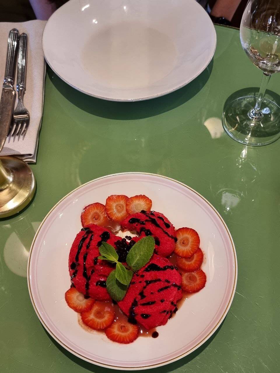Помимо новинок, мы не смогли пройти мимо нескольких хитов меню. Приятное впечатление производит земляничная страчателла (880₽). И хотя в несезон вместо земляники для приготовления блюда используют клубнику, на выходе мусс получается почти воздушным. Он буквально тает во рту и придает сыру совершенно новое, интересное звучание.