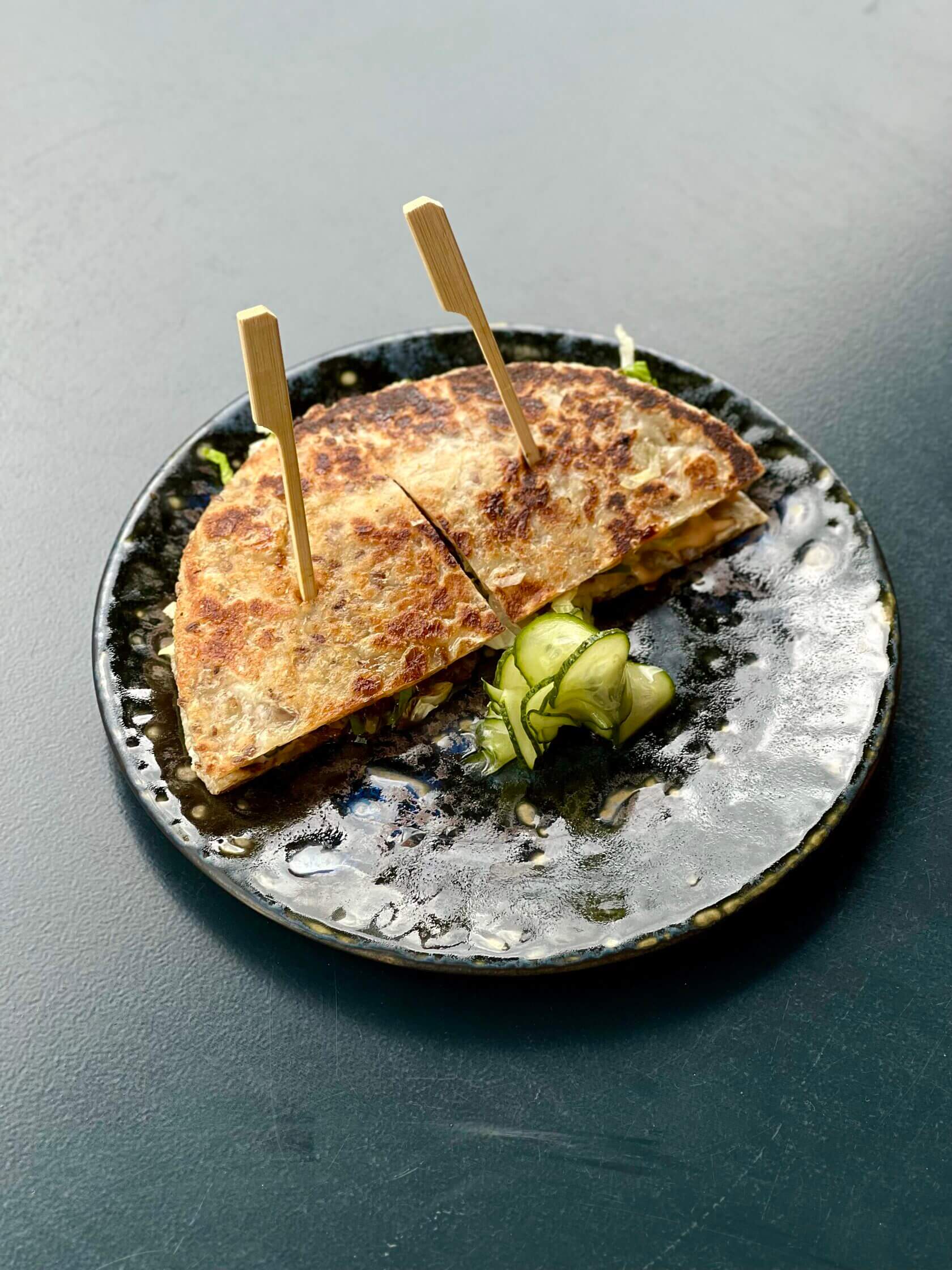 Бриошь с обжаренным до хрустящей корочки цыплёнком, маринованными огурцами, луком фри, миксом салатов и соусом айоли-юдзу. Подаётся с зелёным луком и кунжутом с кимчи. Смело пробуйте.