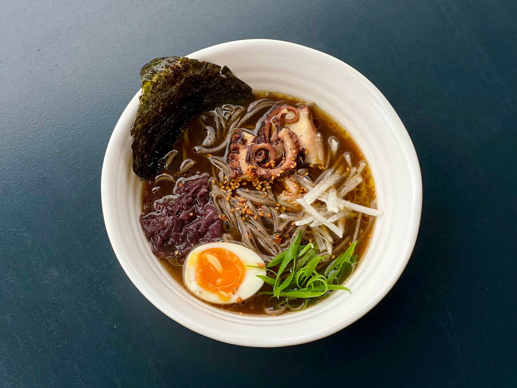 Для составления рецептов шеф-повар привлекал модные нынче нейросети, и это считывается: есть неожиданные решения. В рамене, который мы взяли, вместо канонической пшеничной лапши используется гречневая соба. Плюс трюфель, плюс осьминог, и это всё за 490 рублей, на минуточку.