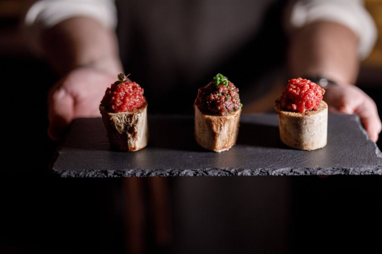 В сет входят закуски из говядины, хлеб, аночоусы, трио тартаров, татаки из говяжьей вырезки, запеченный лук-порей, говяжья печень и крем-каталана на десерт.