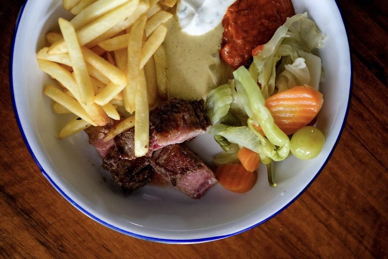 В спешл меню вошли: свиной шашлык в пряном маринаде с яркими специями (650р.) и куриный шашлык (350р.), а также кебаб на тарелке с говяжьим беконом (550р.), овощами и картофелем фри. Шашлыки украшают зеленью, а подают с маринованным луком и аджикой.