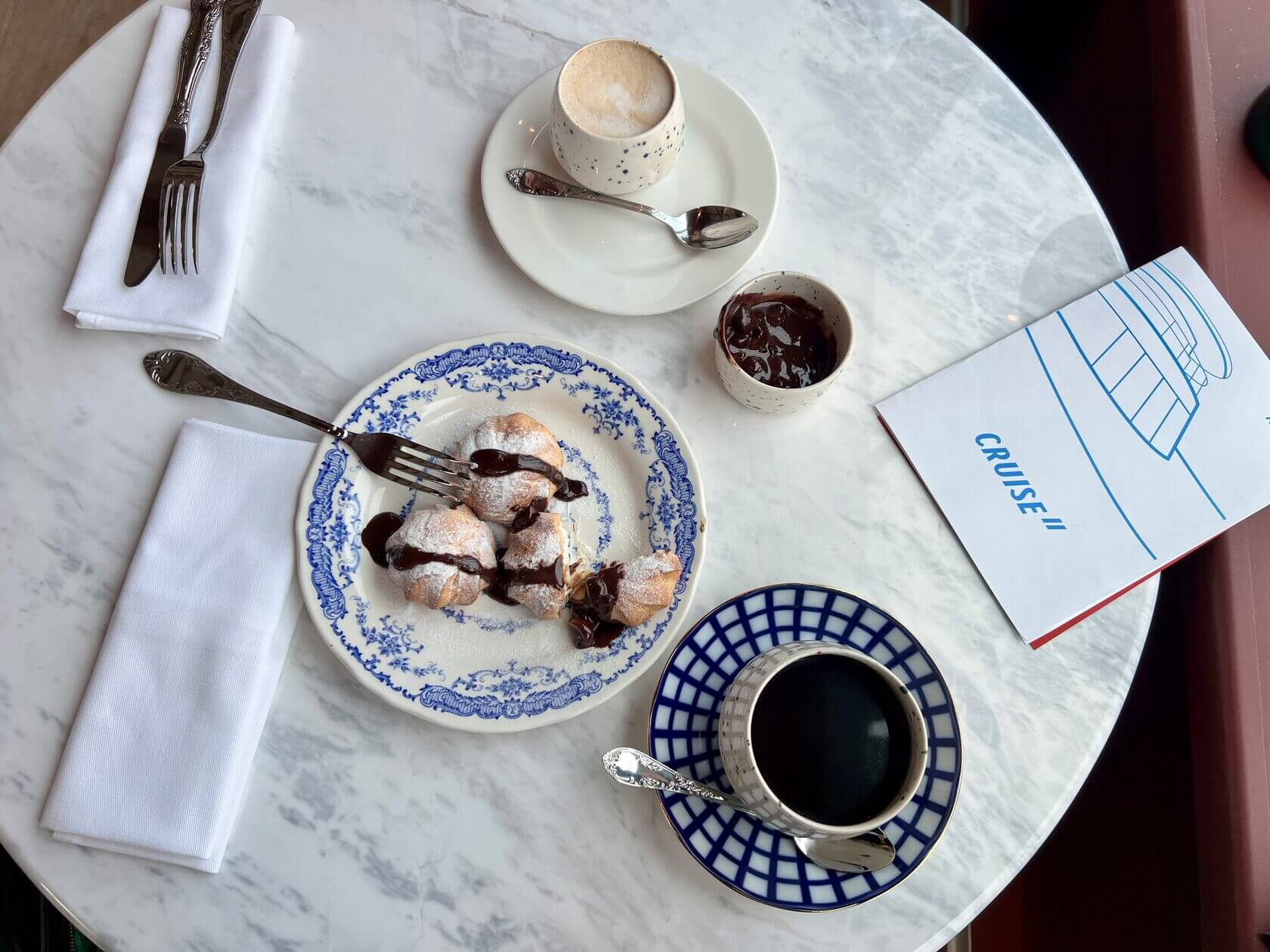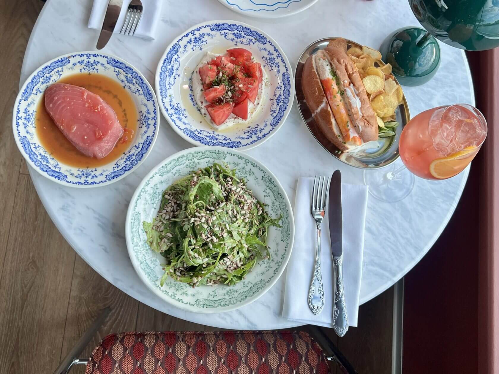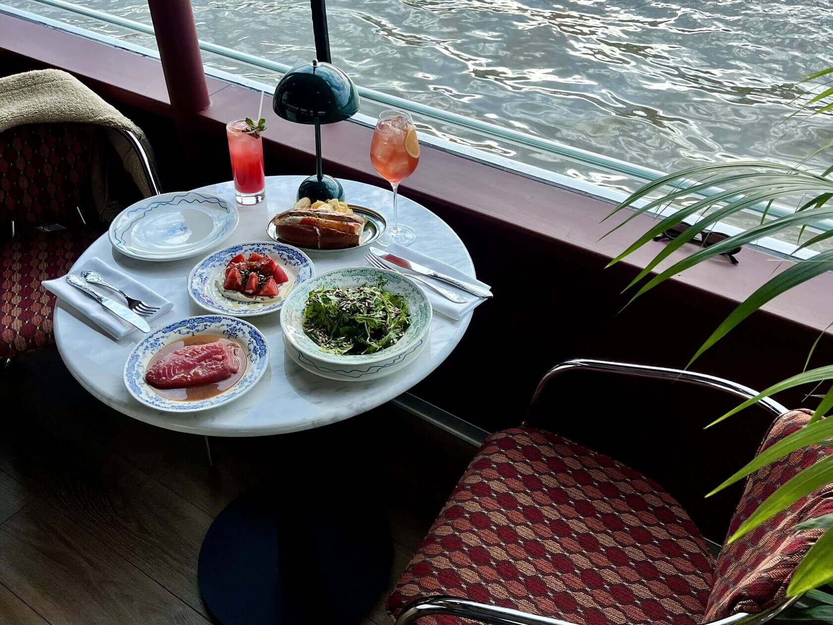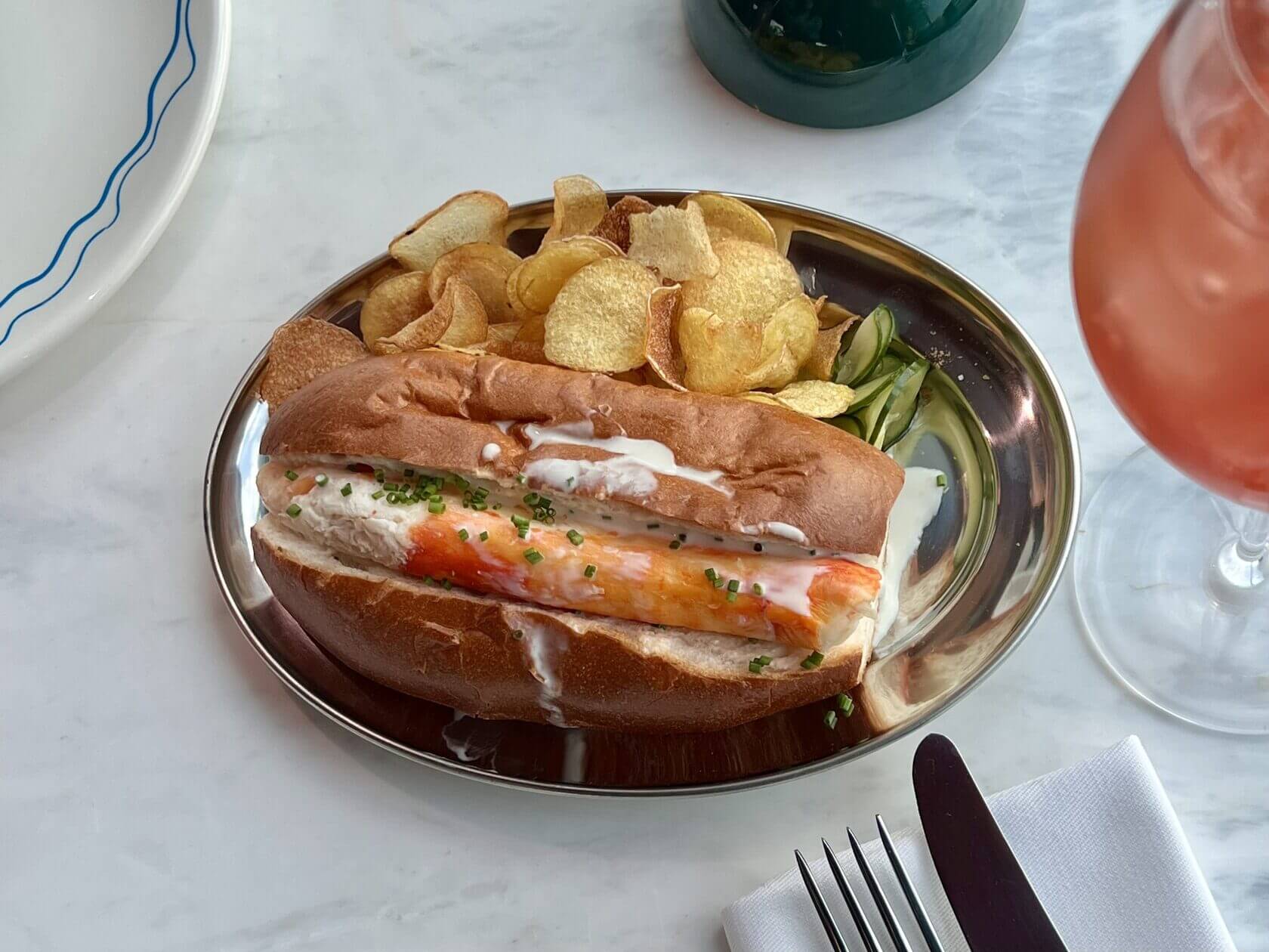Круизное меню собрали из пяти разделов. Как рассказывает шеф Руслан Закиров, сделано это для того, чтобы гостям было «проще ориентироваться и подбирать блюда исходя из времени рейса. Например, днём хочется чего-то легкого, а вечером тёплого и чуть более сложного». Так-то оно так, но вот зеленый салат (650₽), не смотря на его невесомость (в тарелке лишь зелень, семечки и ореховая заправка), заказывать хочется на завтрак, обед и ужин. Крудо из тунца (650₽) с томатным понзу также может оказаться мастхэвом вне зависимости времени и погоды — свежий, «спелого» розового цвета. Замахнуться вилкой уже ближе к вечеру стоит на аранчини с креветками (790₽) в компании лечо и пекорино, или же, вовсе отложить эту вилку в сторону, потому что пришло время фирменного хот-дога с крабом (1500₽).