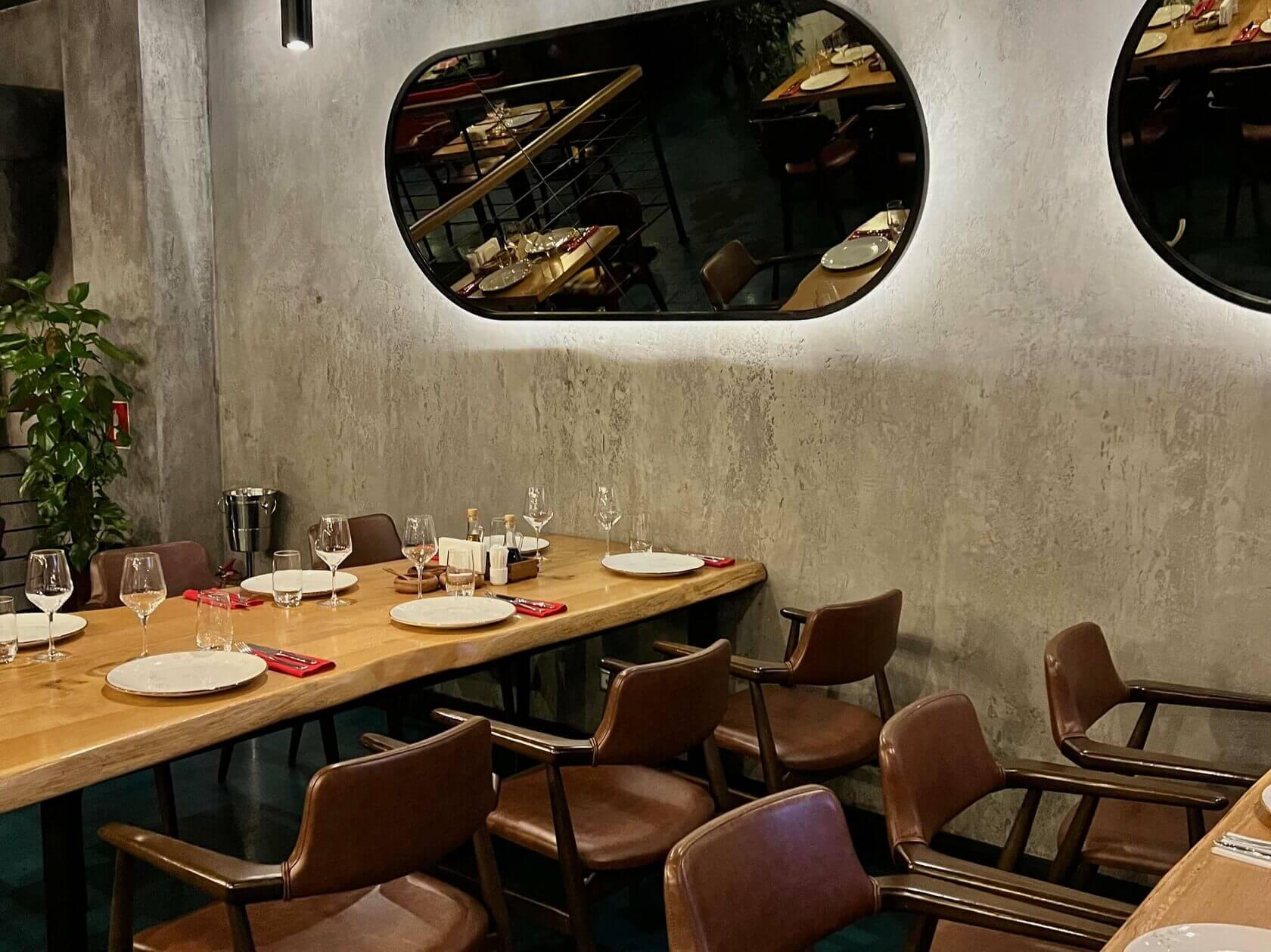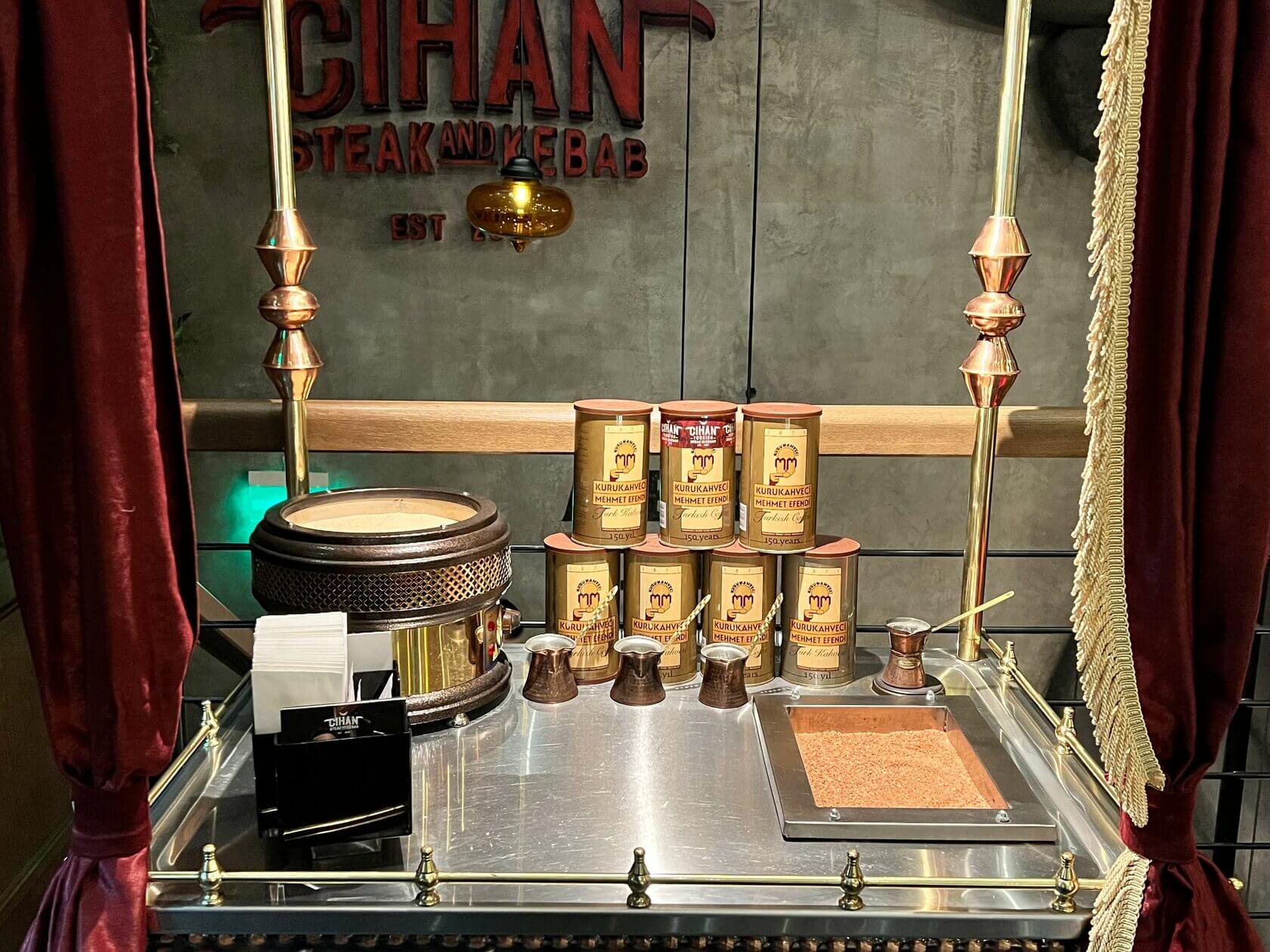 Стоит сказать самое главное — ресторан Cihan назван в честь Джихана (читается название ресторана именно так), ведь не только меню, но даже интерьер — идея шефа. Турецкий вайб в виде цветных свисающих ламп и отдельно стоящей стойки, где варят кофе на песке, разбавляется кожаными стульями и массивными столами. Рассадка по принципу старой школы — просторная для передвижения и жестикуляции.