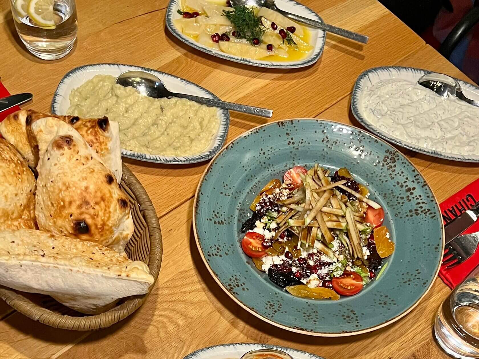 Сет мезе приносят гостям на деревянном подносе, предлагая выбрать «по обложке» понравившиеся закуски. Не самая яркая часть кухни, однако, внимания точно заслуживает свежий, кисломолочный, с чесночной нотой, хайдари; закуска из баклажанов, по вкусу напоминающая бабагануш, и необычный корень сельдерея в сладком сиропе.
