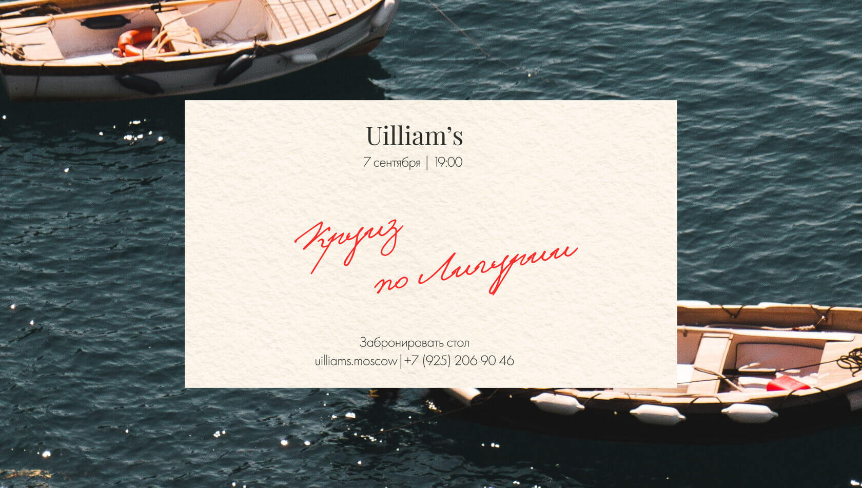 7 сентября в Uilliam’s состоится первый осенний ужин. 5 блюд лигурийской кухни и специально подобранные вина к каждому курсу.