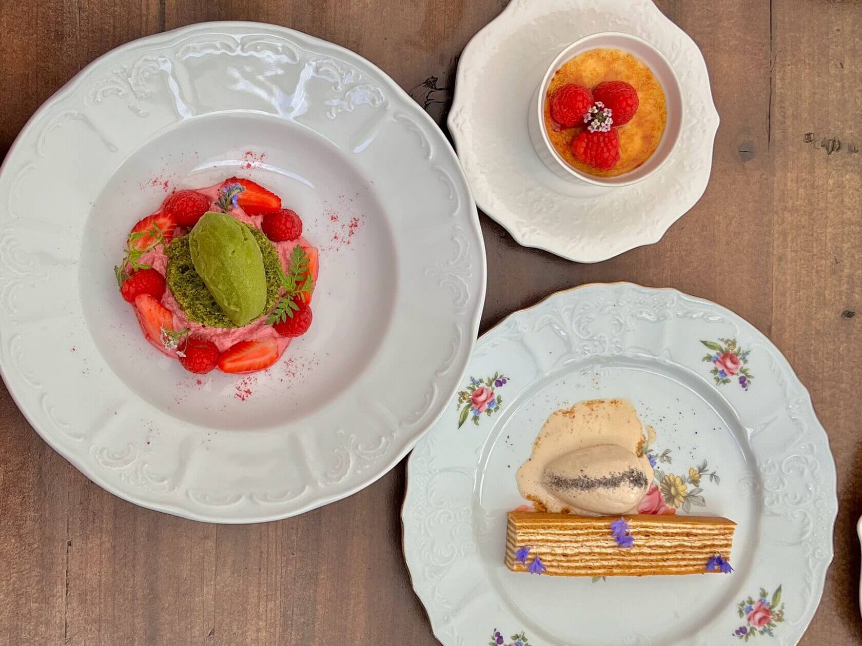 из интересного в меню десертов — еще и медовик с мороженым из сена (550₽) - он справа внизу; тот самый летний десерт , с петрушкой внутри - вверху слева.