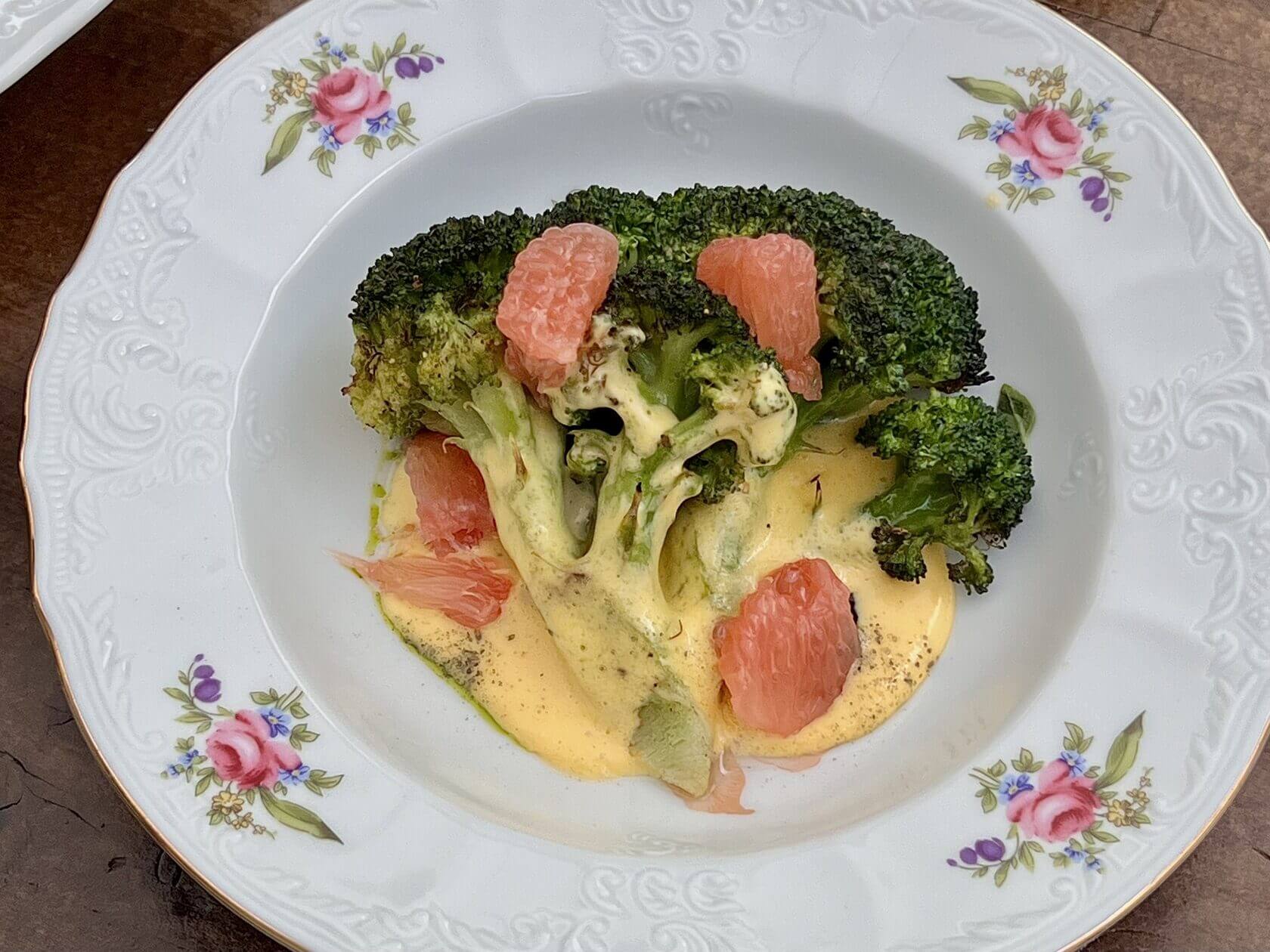 Еще одной радостью лета обнаруживаем брокколи, грейпфрут и соус беарнез (720₽). Традиционным компаньоном для французского яично-масляного соуса является бифштекс, в Яузе же его добавляют к овощу на гриле, получая вполне гармоничное сочетание. Единственный, кто слегка из этой картины выбивается — это добавленный грейпфрут.