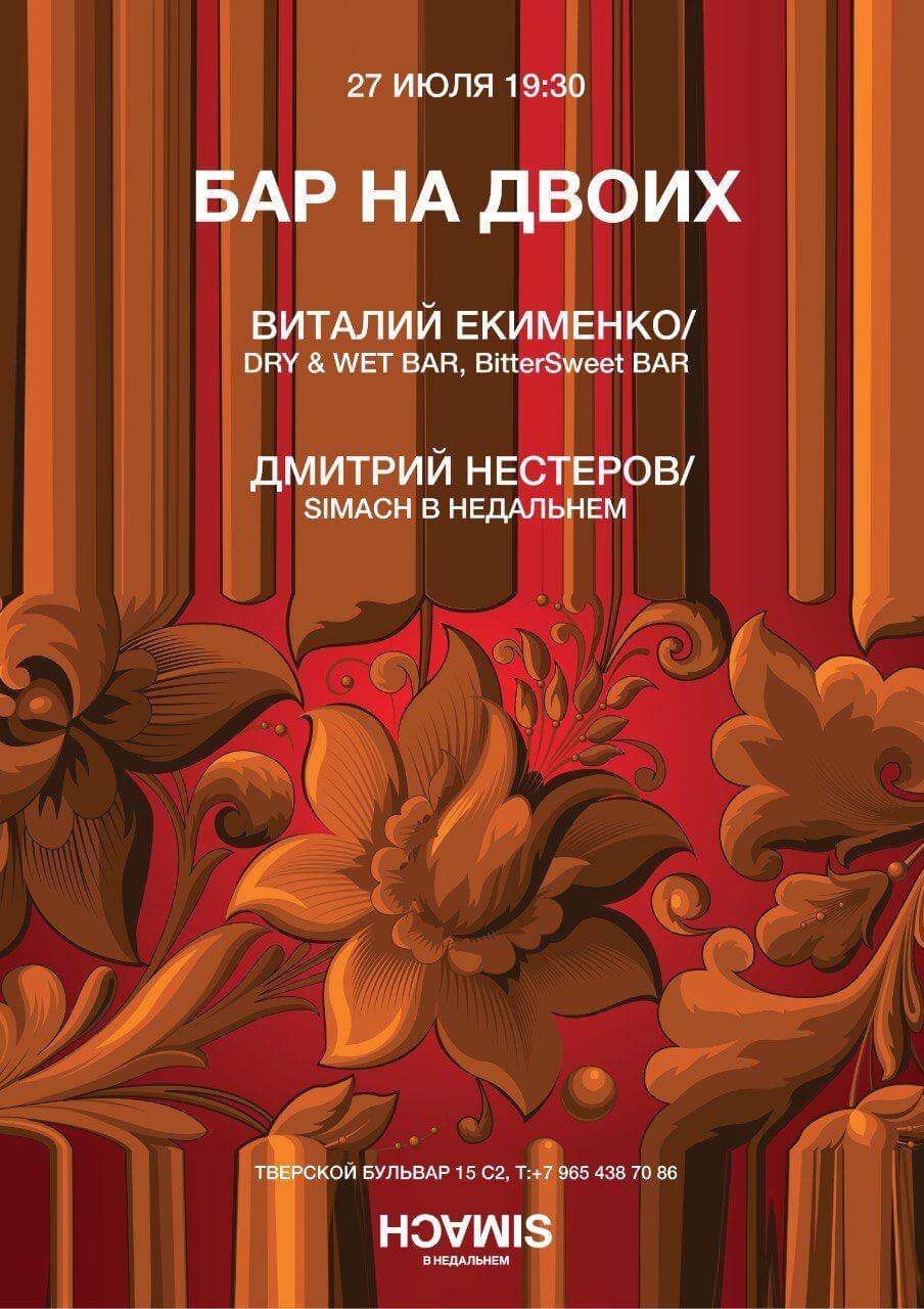 В в private-баре на втором этаже «Симача» впервые вместе за стойкой будут две легенды барной Москвы: Виталий Екименко — трижды лучший бармен России и Дмитрий Нестеров — шеф-бармен Simach в Недальнем. Их обоих уже редко можно увидеть за барной стойкой, поэтому возможность встретиться, поговорить и попробовать из первых рук, смешанные ими коктейли, — удача, которой нельзя не воспользоваться!