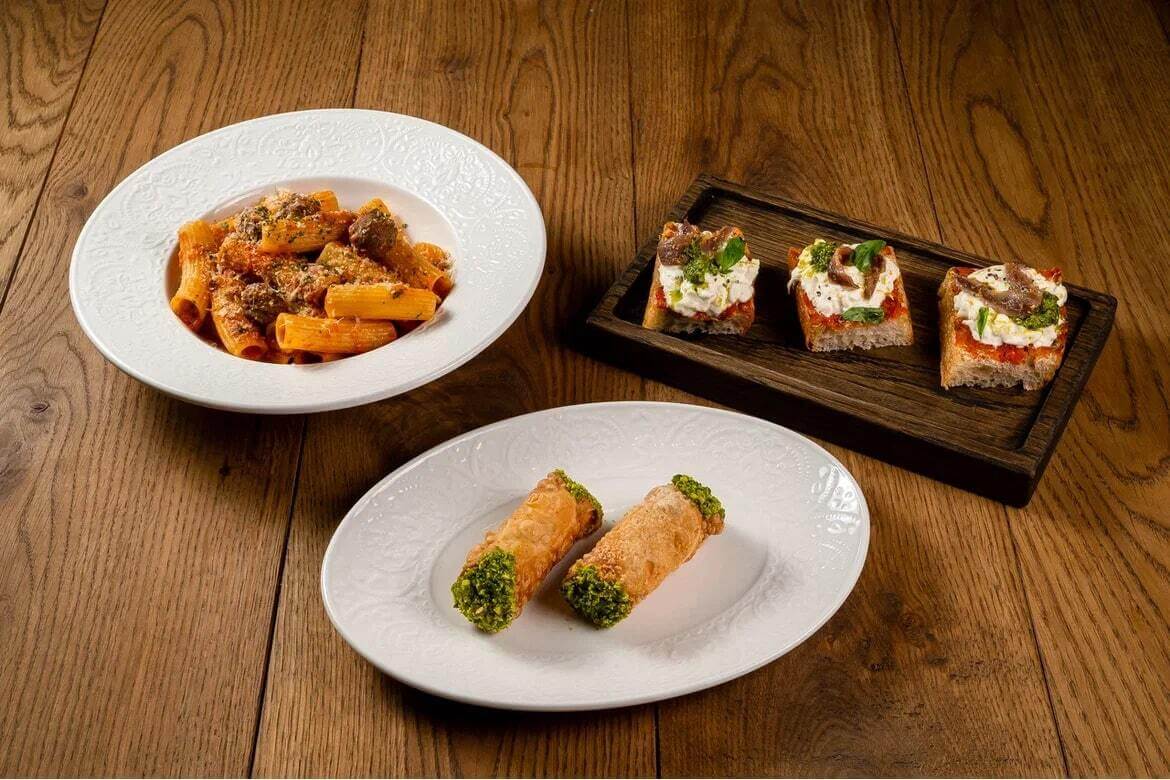 Фестивальный сет из de Torino по мотивам сериала «Сопрано»: сицилийская фокачча с анчоусами, любимая паста Тони Сопрано — зити с митболами и фисташковые канноли «Капореджиме» для донов и их спутниц.
