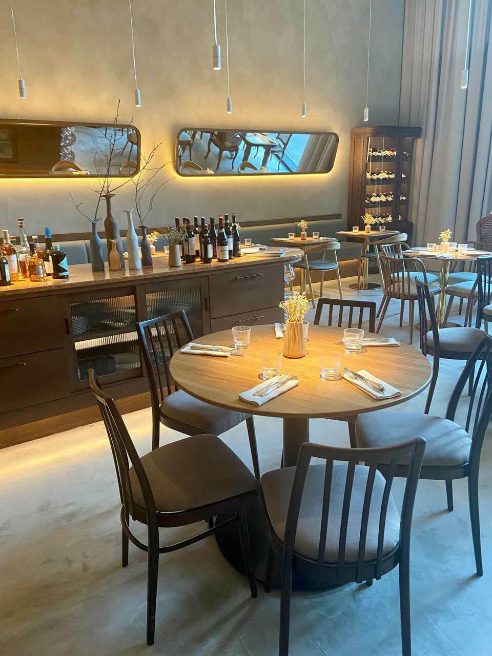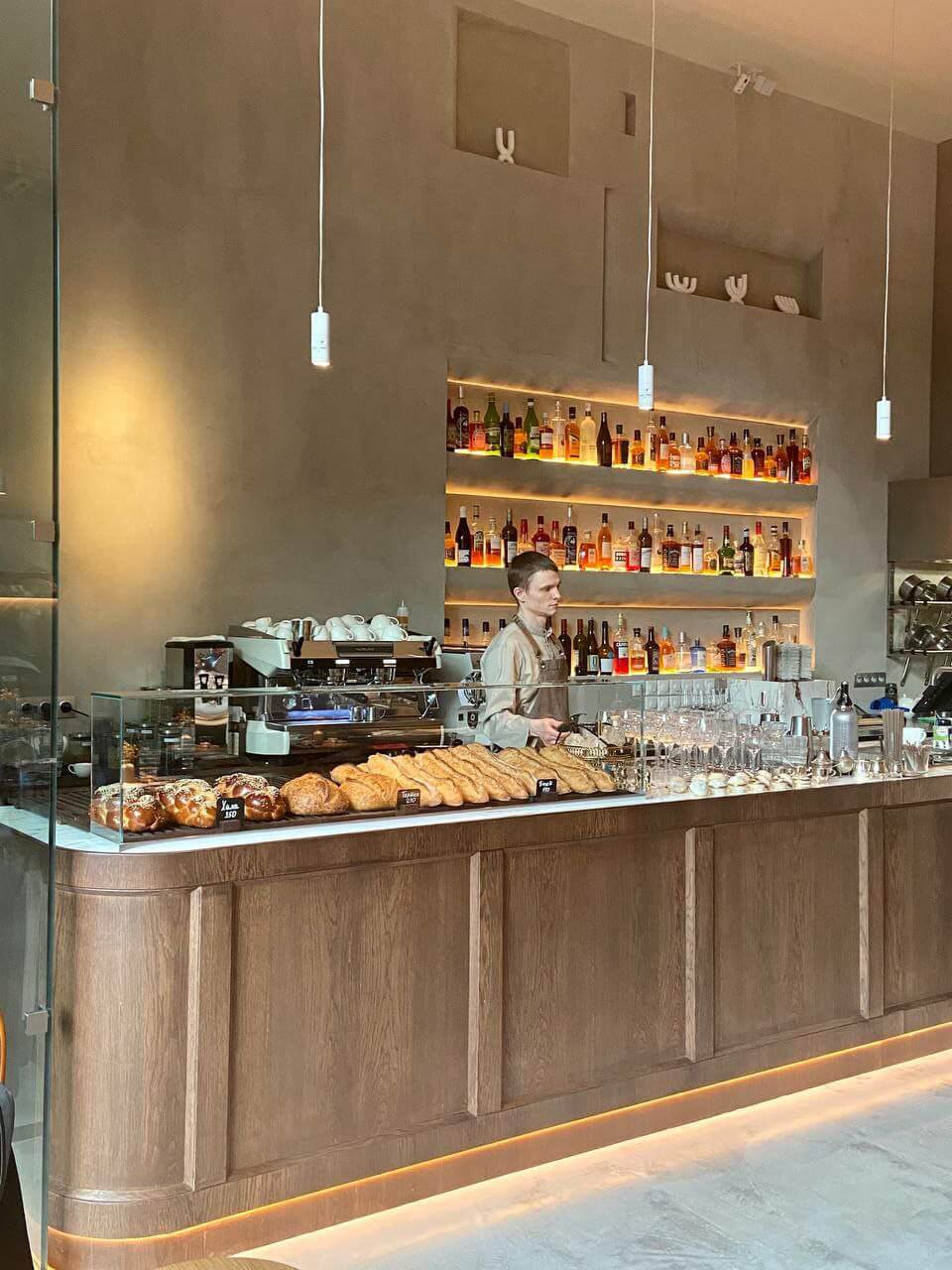 Интерьер получился весьма сдержанный, с высокими потолками, модными сейчас обзорными зеркалами, открытой кухней и большим хлебным прилавком. Нашлись и интересные детали, например, оливковое дерево и винтажная мебель с посудой. В целом, атмосфера очень домашняя, и это ожидаемо, ведь заведение находится внутри большого ЖК.