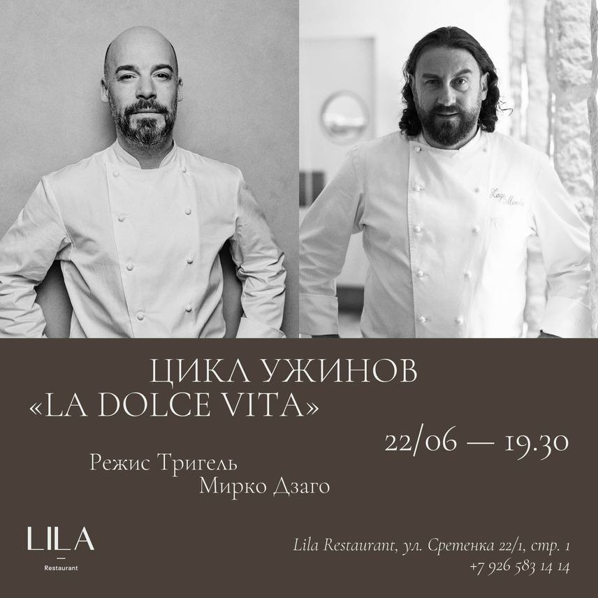 Рестораторы Галактион и Элина Табидзе запускают цикл ужинов под названием «La dolce vita». Приглашенные итальянские шефы и друзья бренд-шефа Режиса Тригеля будут делиться своими гастрономическими идеями с гостями.22 июня цикл ужинов откроет Мирко Дзаго, шеф-повар ресторанов «Onest» и «Аист». Его гастро-философия заключается в использовании сезонных и свежих ингредиентов, а блюда получаются простыми, но при этом интересными.Два шефа, Режис Тригель и Мирко Дзаго объединят свои силы и техники, чтобы удивить вас новыми шедеврами.Дата и время: 22 июня, начало ужина в 19:30Цена: 15 000₽Сретенка 22/1с1+7 926 583-14-14