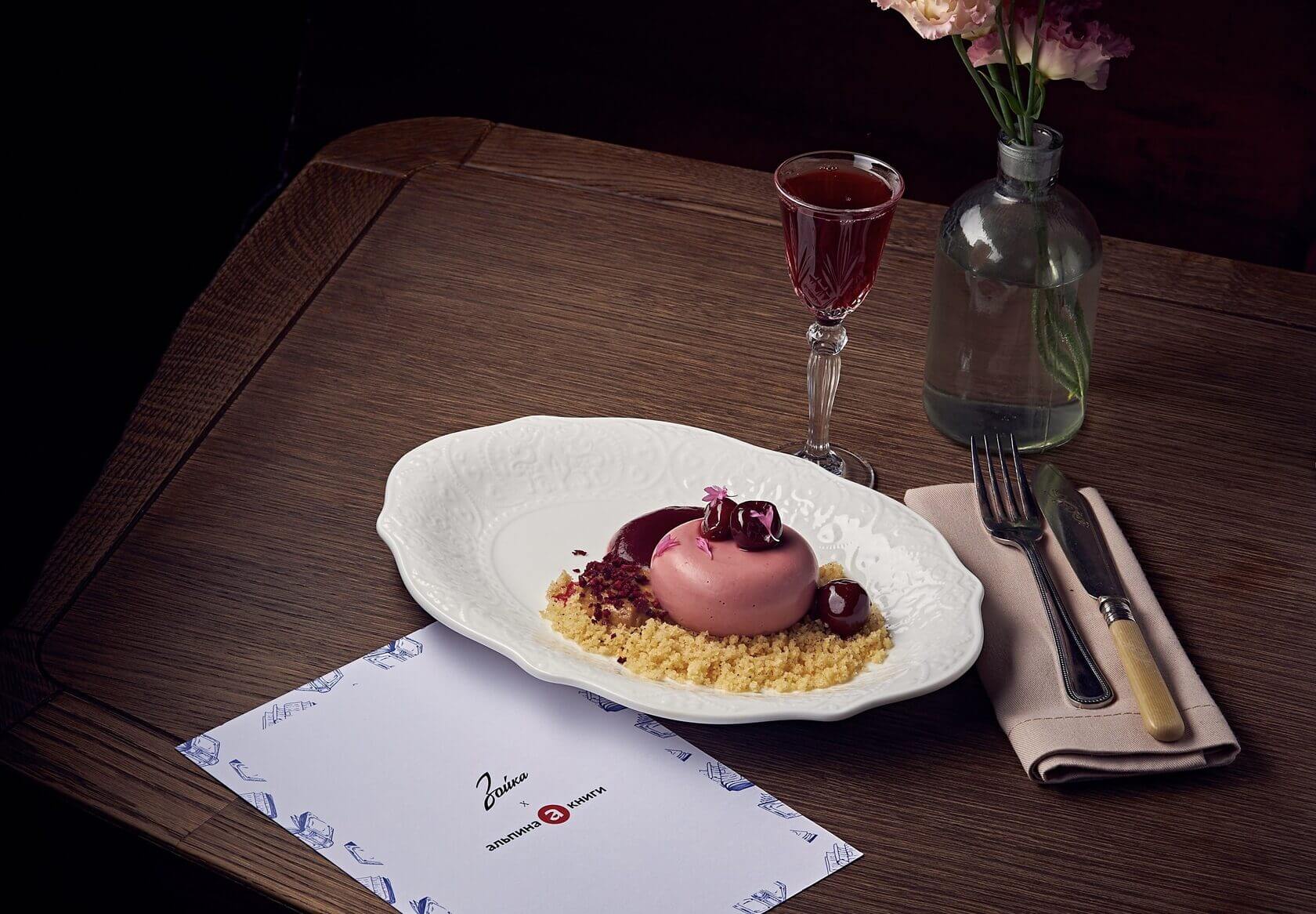 В основе десерта — миндально-коричный бисквит, гречишное пралине, и, конечно, спелая вишня, вымоченная в кальвадосе. Над сочетанием и литературно-гастрономическими параллелями трудилась шеф-повар Полина Емельянова, вдохновляясь не только историей из пьесы, но и другими книгами о стойкости и красоте женщин. Дополняет вкусовую картину терпкая наливка «Вишневый сад».