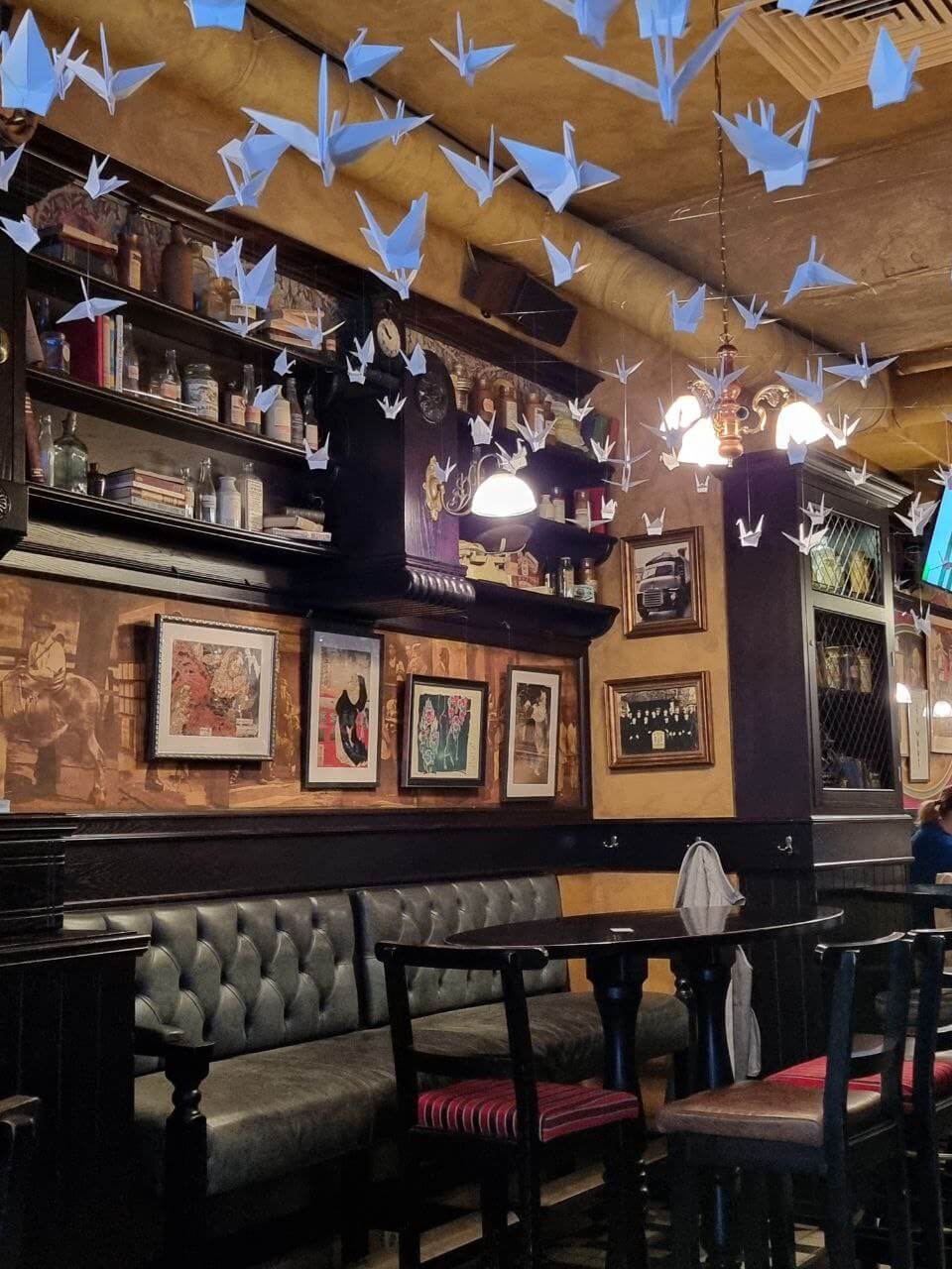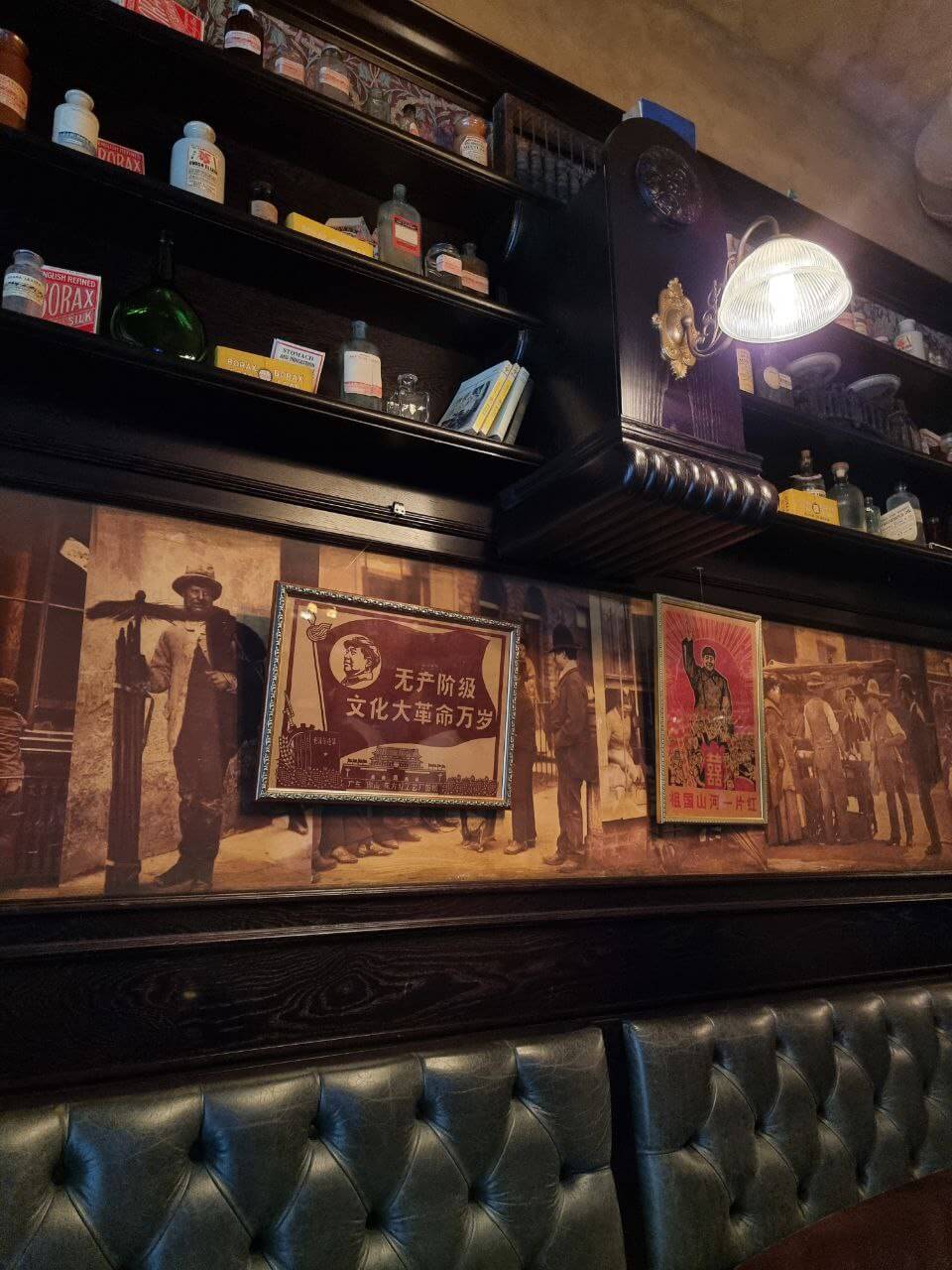 Помимо меню изменения коснулись и интерьера: на стены повесили китайские постеры, расставили фарфоровые вазы, появились антикварные предметы и витрины с аптечными банками-склянками в старинном стиле. В честь дня рождения потолок украсили 600 журавлями-оригами. Жаль, что их сразу убрали, смотрелось очень эффектно.