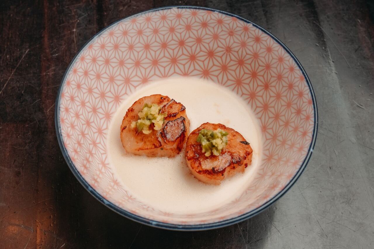 Гребешок, юдзукосё (1000₽) подаётся с соусом на основе масла и бульона даши с добавлением приправы юдзукосё. Гребешки получились мягкими за счет правильно выбранной степени прожарки. Блюдо очень гармоничное и хорошо сбалансированное, тот случай, когда ничего не хочется переделывать или добавлять.