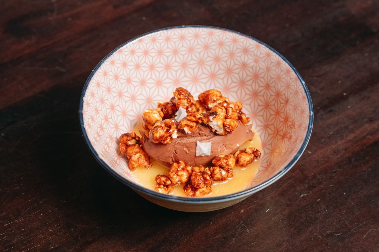 Намелака шоколад, мисо попкорн (550₽) оказался весьма аутентичным десертом, ранее нам нигде не попадался. Намелака — слово японского происхождения, означающее «гладкий, сливочный». Значение в полной мере отражается в самом десерте: сливочный крем на основе темного шоколада, сливок и молока, шелковая гладкая структура и нежный вкус. Подача в густом апельсиновом соке с попкорном мисо придает особенный шарм десерту благодаря нежной текстуре и легкой пряности.