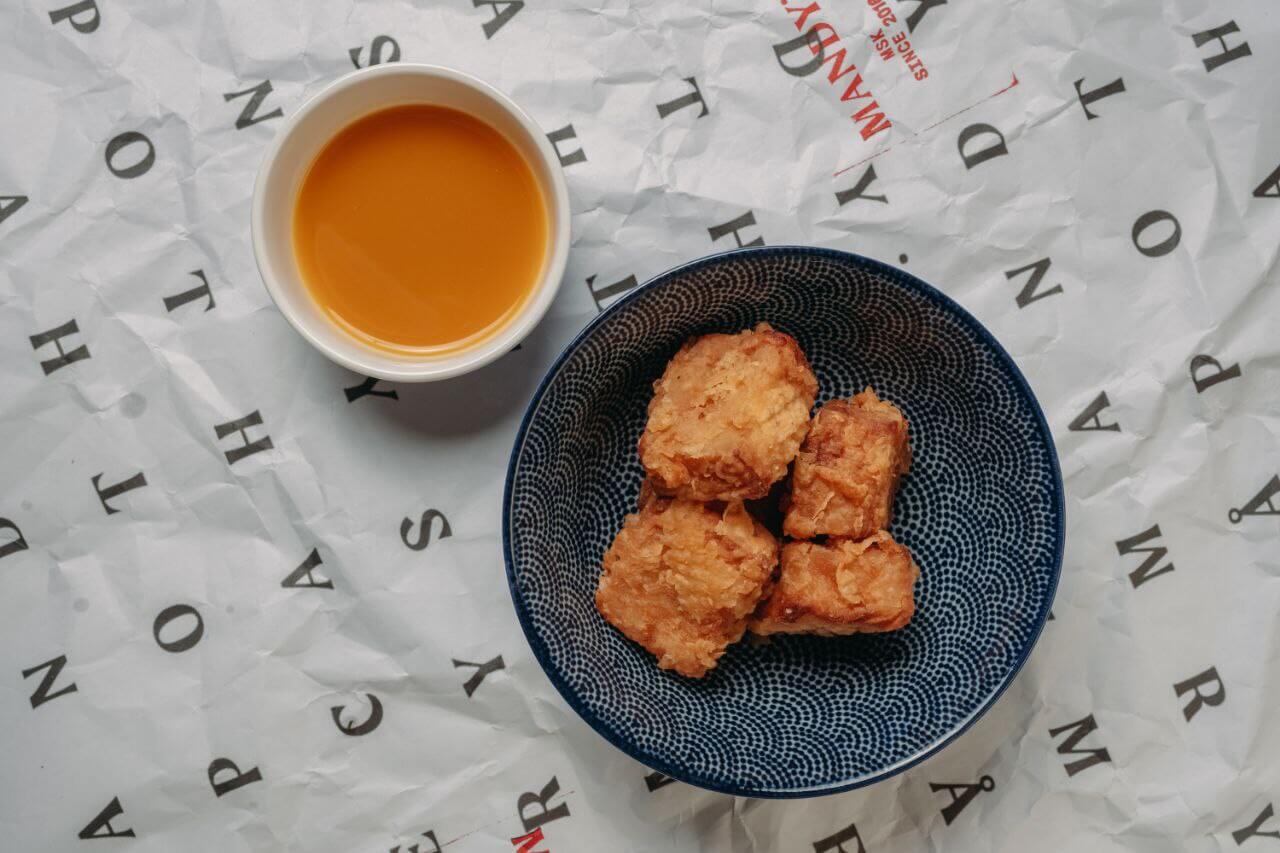 На прощание решили попробовать оба десерта в меню. Жареное молоко, манго, маракуйя (550₽) известен как один из самых популярных китайских десертов в мире. Смесь кокосового молока, коричневого сахара и экстракта ванили сгущают крахмалом, а потом обваливают в специальной панировке. В Mandy его подают в сопровождении соуса из пюре на основе двух очень азиатских фруктов, манго и маракуйи. На выходе получается сытный десерт, который смело можно (и даже нужно) брать на двоих.
