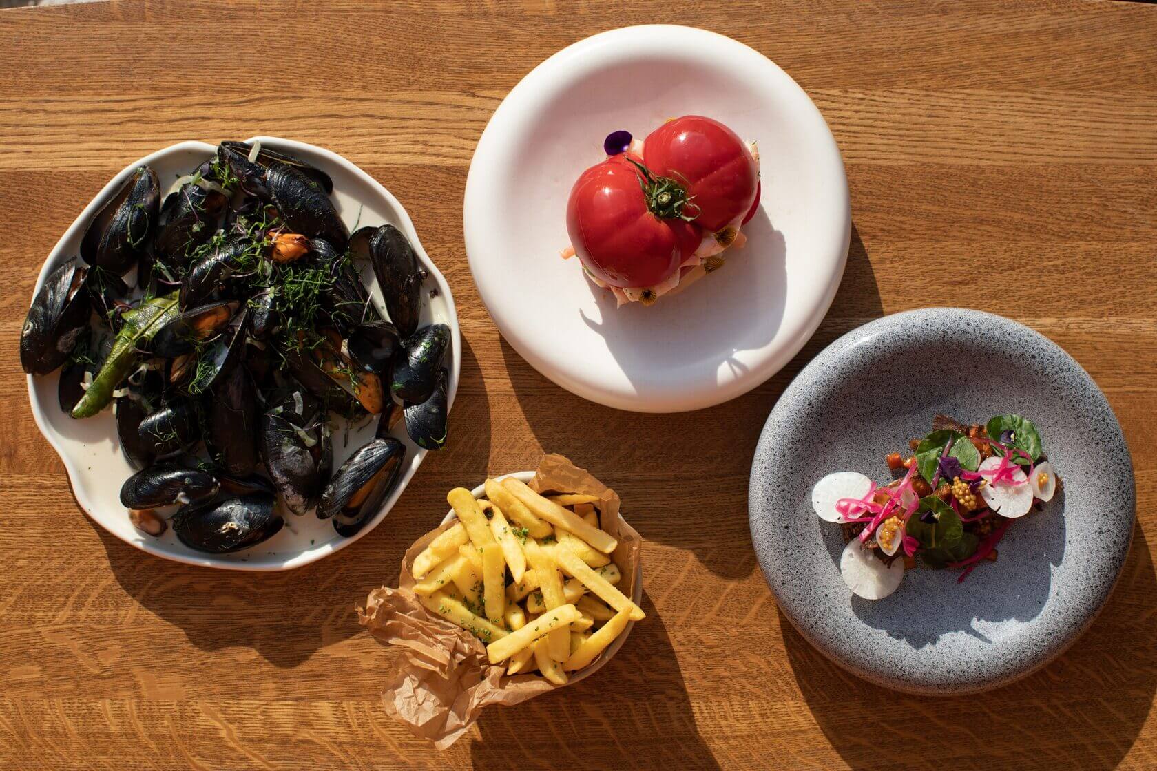 Тарас предлагает попробовать фламандское рагу с говяжьими щёчками и овощами на тосте из домашнего хлеба со льном, томат с северными креветками, айоли и сливочным кремом и блюдо на двоих – мидии, тушёные в белом вине с кокосовым молоком, перечной пастой и листьями лайма, и картофель фри.