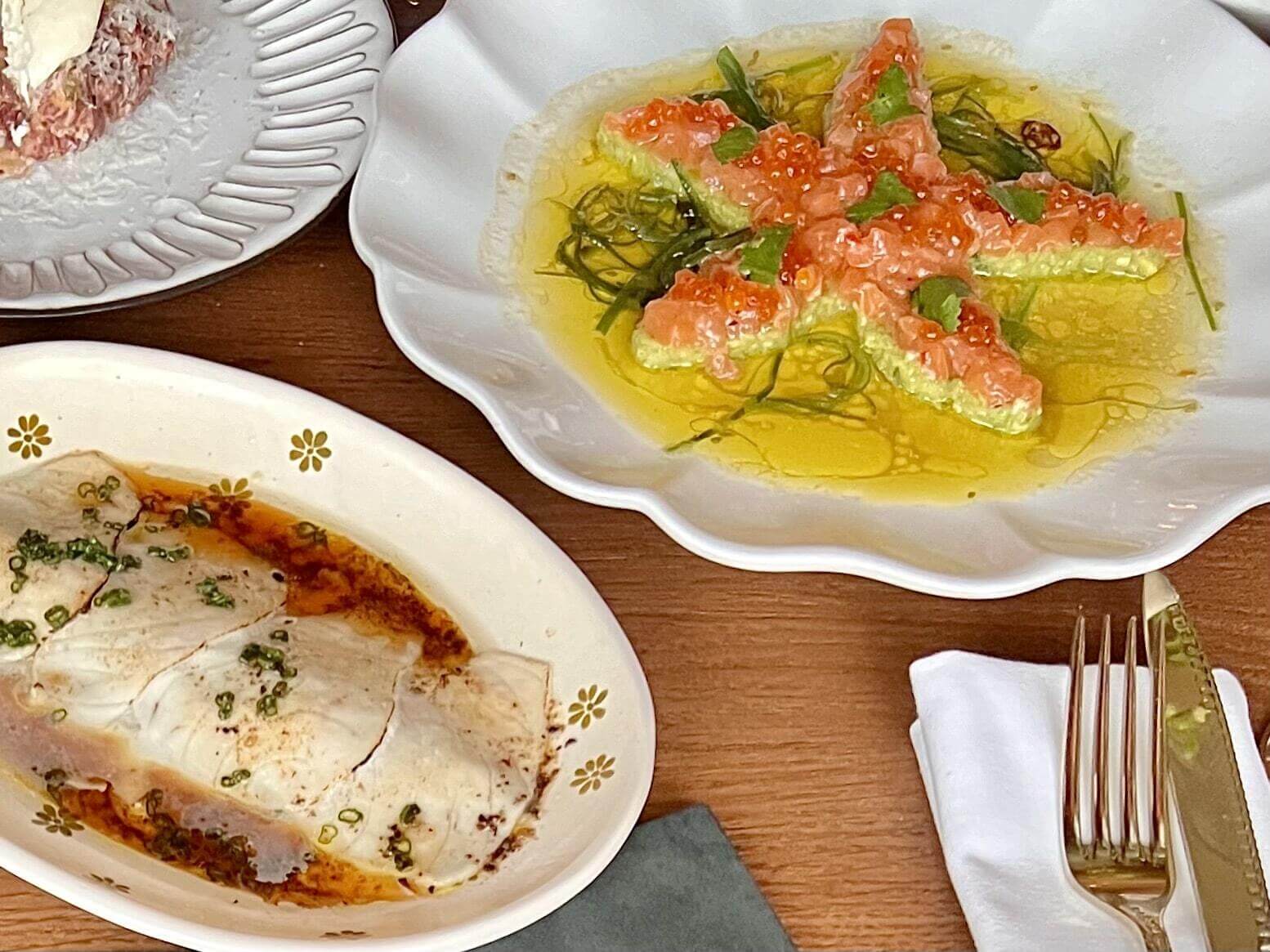 тартар из лосося с авокадо и лаймом (1100р.) и татаки из масляной рыбы с огурцом и трюфельным соусом (880р.)