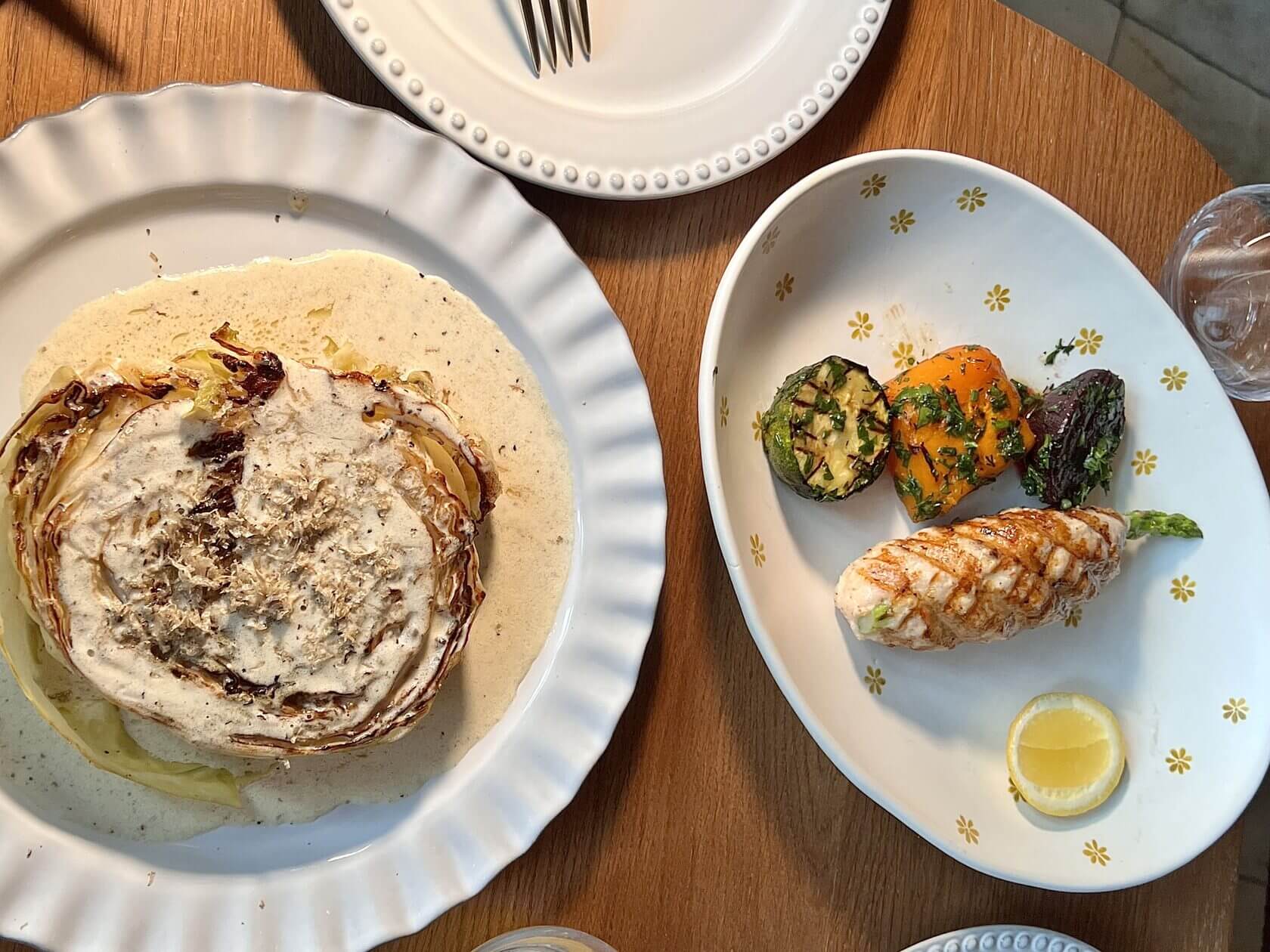слева — запеченная капуста с трюфелем (850р.), справа — кебаб из креветки на спарже (990р.)