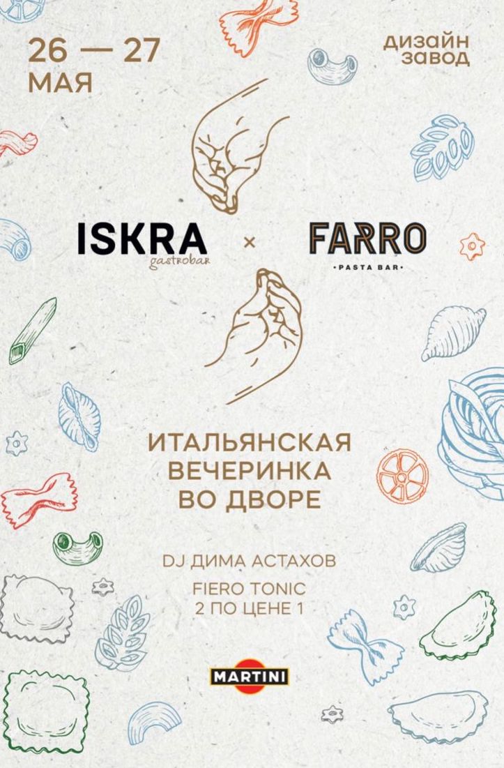 Итальянские выходные в Москве — легко! В гастробар ISKRA приезжает шеф-повар ресторана FARRO Максим Клыков. Под аккомпанементы коктейлей шеф приготовит свои фирменные пасты — Черные спагетти с ростбифом в соусе черный перец, Тальятелле с креветками в соусе Том ям и Карбонара с копченым тунцом. Музыкальное сопровождение вечера возьмет на себя диджей Дима Астахов, а Fiero Tonic будут предлагать 2 по цене 1.