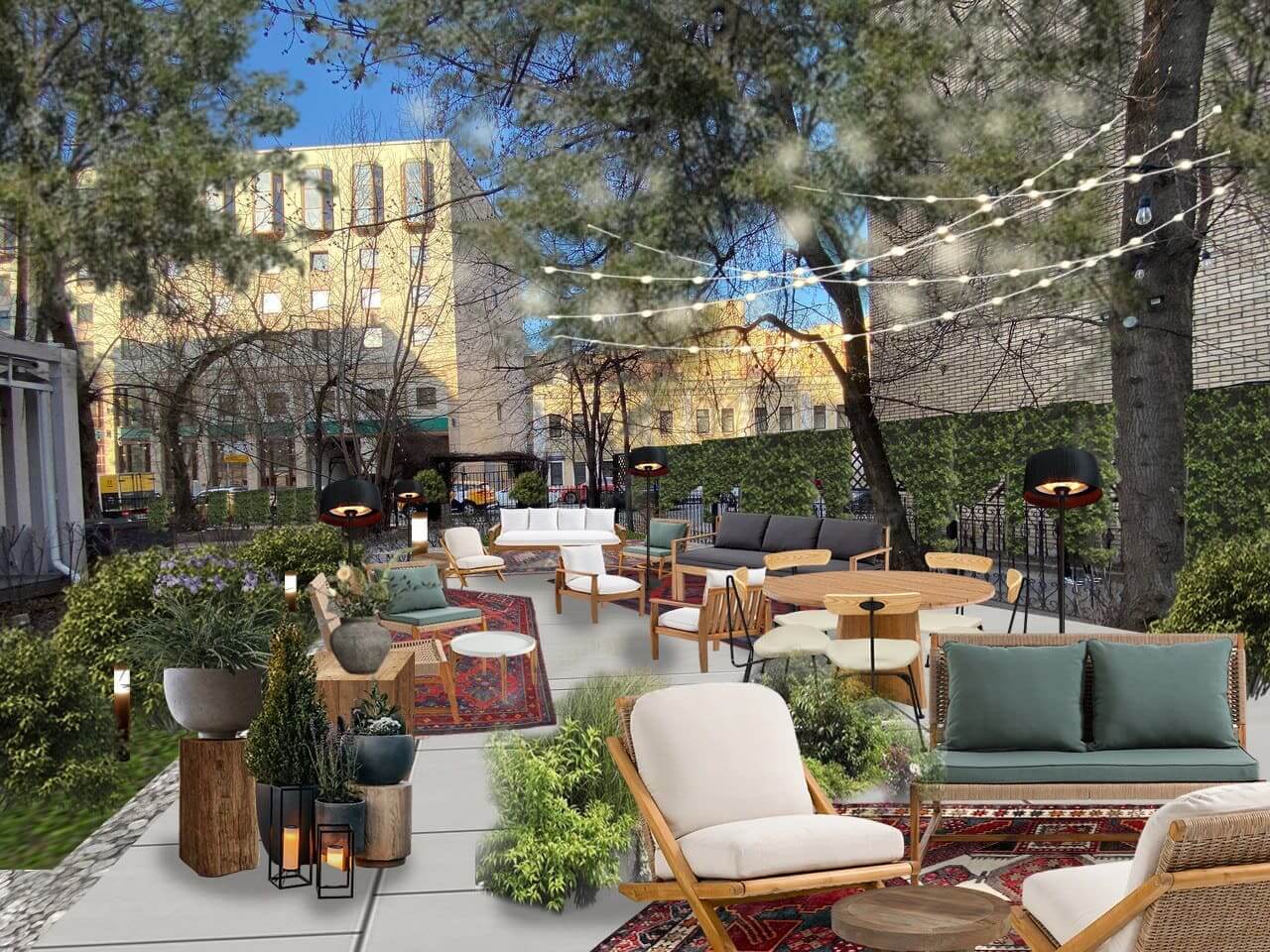 Во дворе – просторная лаунж-зона под липами и каштанами с площадкой для игры в петанк днем и диджей-сетами по вечерам.