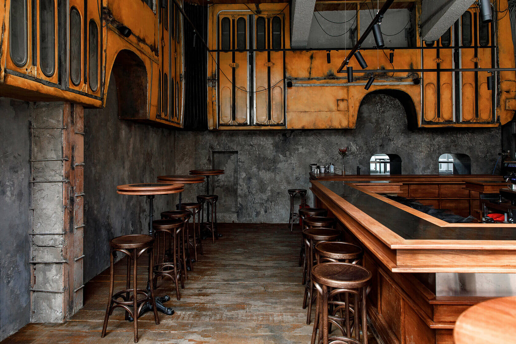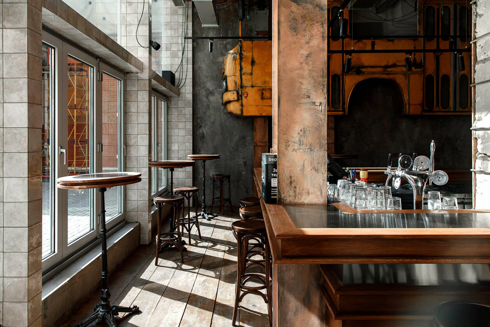 Небольшой зал с высокими потолками. В интерьере много стекла, бетона и дерева. Панорамные окна наполняют помещение светом. Посередине расположена островная барная стойка.