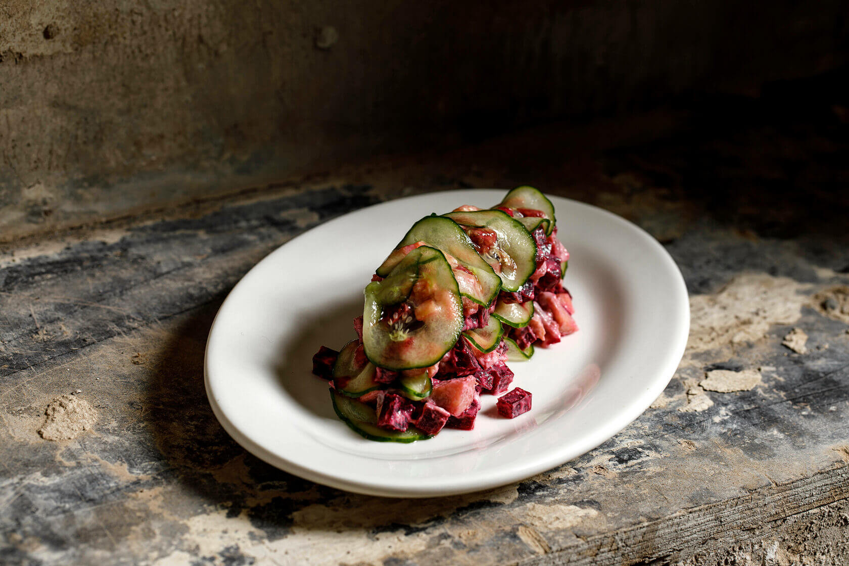 Из раздела закусок стоит отметить и непременно попробовать винегрет со скумбрией (370₽), неожиданно отличное сочетание свеклы, скумбрии и … зеленого яблока! Свиные шкварки (370₽) с шикарным соусом идеально подойдут в качестве закуски для старта, а венгерские мясные конфеты (330₽) из хрустящего теста фило с начинкой из гуляша непременно понравятся сторонникам гастрономических экспериментов. Любителям трюфеля придётся по-вкусу Картофельный салат (370₽). На вид — знакомый оливье, но не все так просто. Он обладает очень яркими и доминирующими нотками трюфеля, а сверху изящно украшен красной икрой.