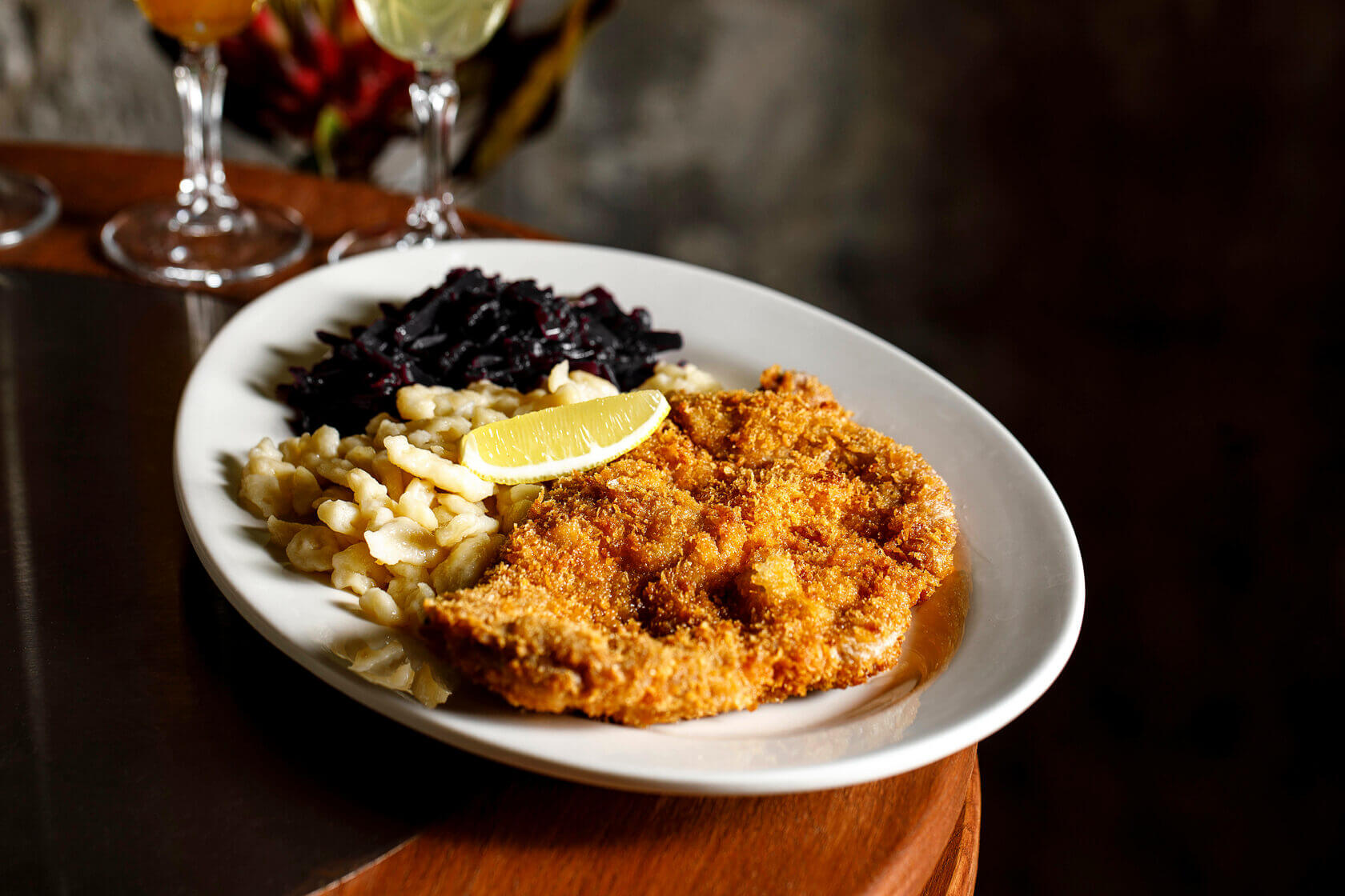 Из основных блюд стоит обратить внимание на блюдо с интригующим названием ТестаФлотилия (430₽). По сути, это любимое многими блюдо из советского детства в оригинальной подаче. Если хочется чего-то знакомого и простого, берите сытный Венский шницель (550₽) с капустой и традиционным немецким гарниром шпецле (немецкие макароны).