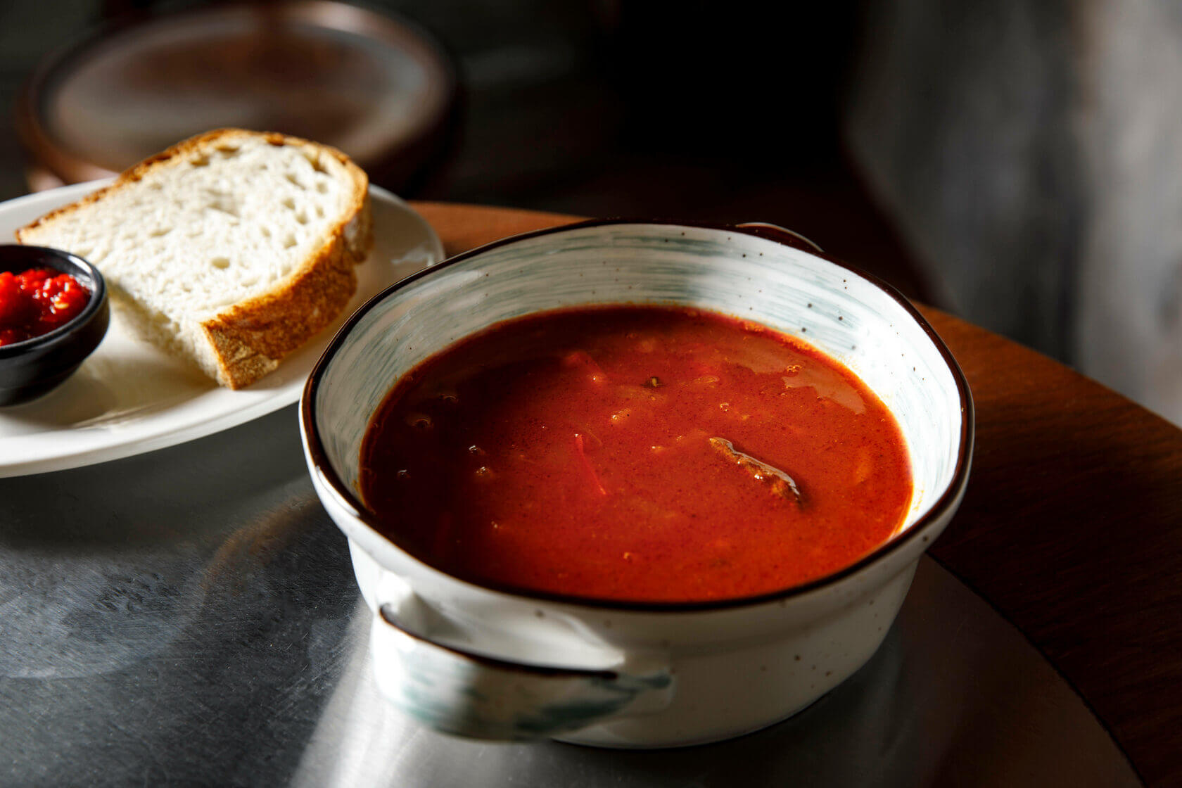 Звездой дегустации стала щедрая порция супа Роял Гуляш (530₽). Его готовят 36 часов, из которых 24 уходит на приготовление бульона. Бульон получается густой и наваристый, а мясо сочное и тает во рту. И всё это с ярким и выразительным вкусом паприки. Подаётся с хлебом и острым соусом.