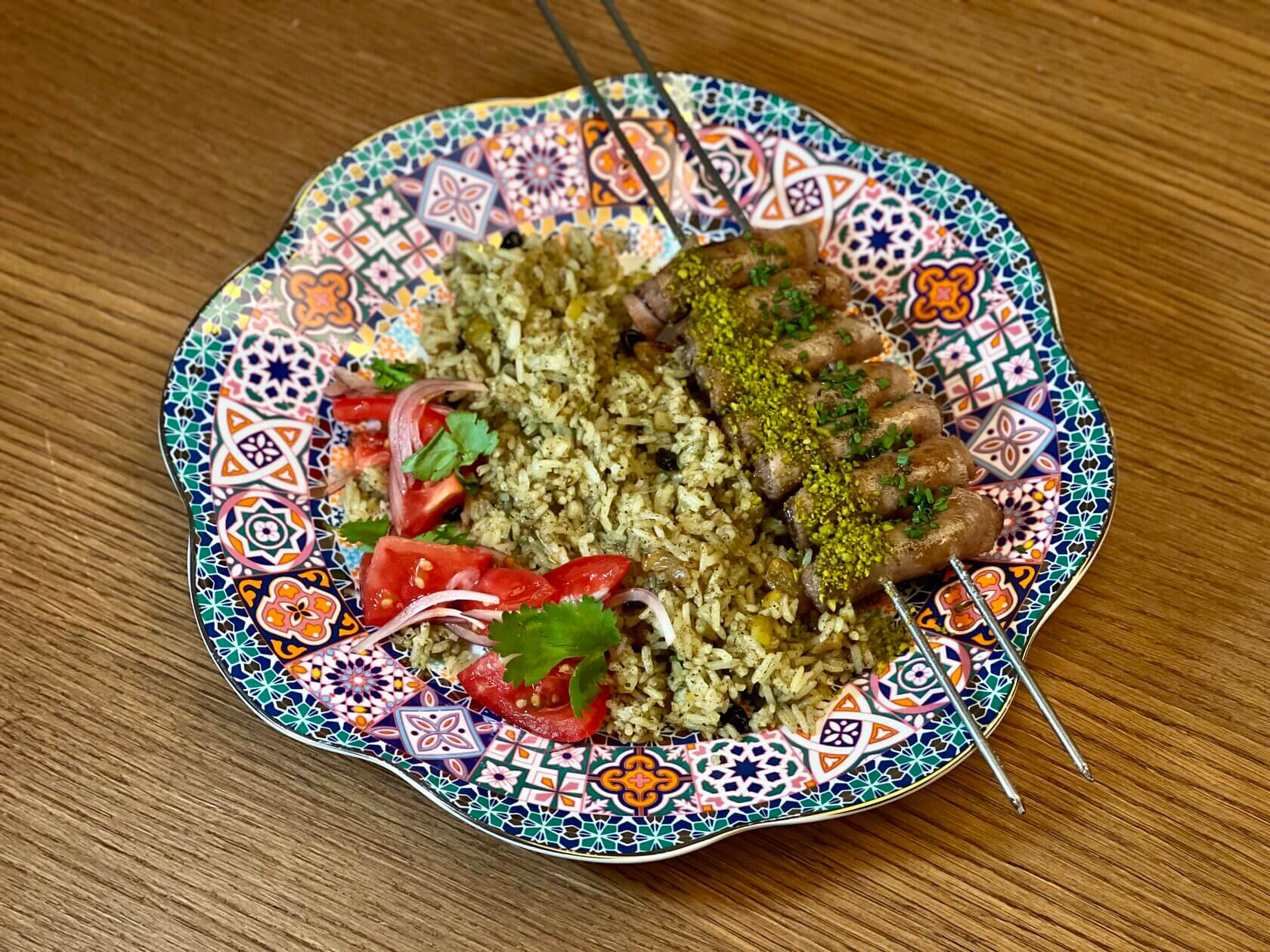 Шашлык из телячьего языка с пряным рисом 740 рублей.