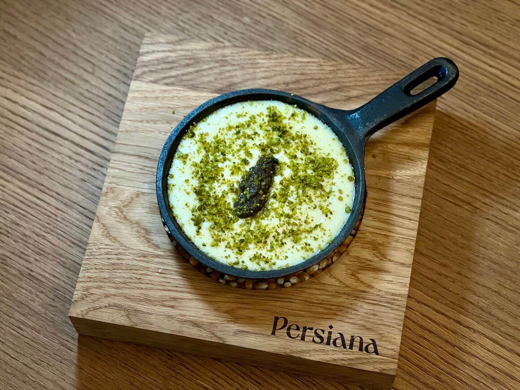 Айладж – заварная кукурузная каша с добавлением ближневосточных сыров, которая подаётся с трюфельной пастой, маслом и фисташками. Вообще фисташки прослеживаются лейтмотивом в большинстве блюд в меню Persiana. И еще одна наша рекомендация: айладж нужно есть горячим, вытягивая кашу вверх (словно проверяя, достаточно ли сыра в каше), чтобы вкус максимально раскрылся.
