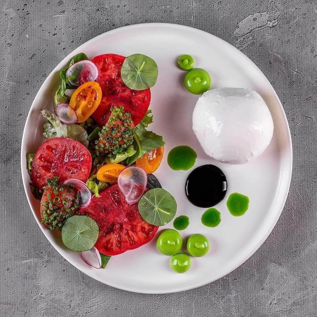 Сезонные томаты с кремом из базилика и остатков настурции, бальзамик из пьяной вишни и перца тимут".