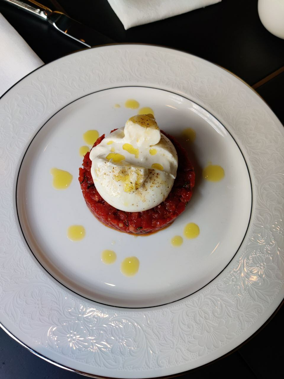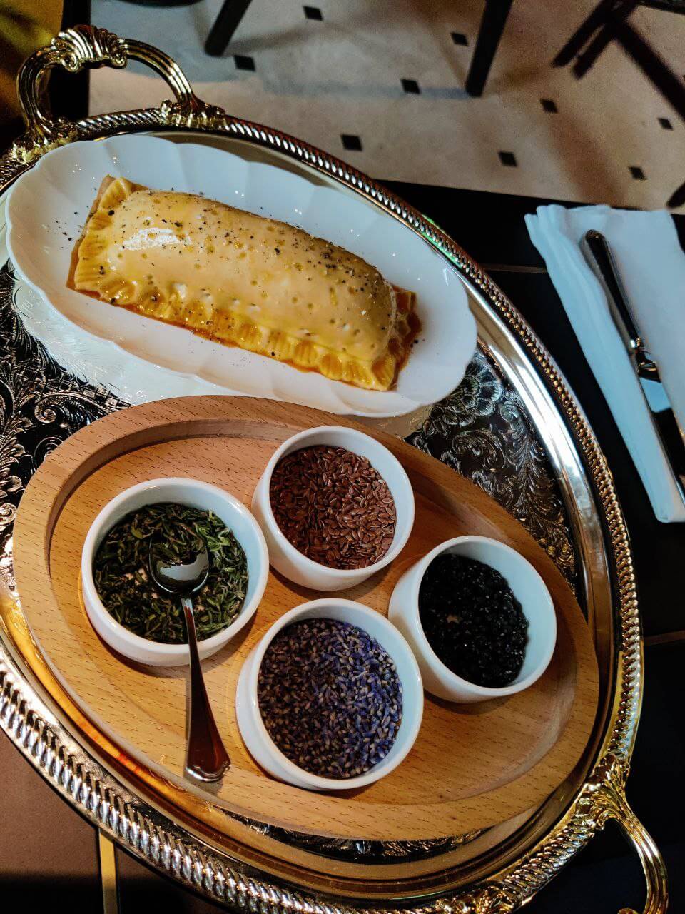 В меню хоть и присутствуют знакомые позиции (например, салат Бора-бора и бургер Афоня), на 70% оно состоит из авторских блюд шеф-повара сети. В разделе “Закуски и салаты” стоит остановить свой выбор на миксе зеленых салатов с цитрусами и сыром горгонзола (890 р.), а также тартаре из говядины с мини-бурратой (1200 р.). А вот карпаччо из пагра (рыбу везут из далекого Марокко) совсем не впечатлило, особенно учитывая высокую стоимость (1700 р.). Среди основных блюд однозначным хитом стал веллингтон с лососем, достаточно редкий “гость” в меню московских ресторанов. Перед запеканием блюдо выносят чтобы узнать предпочтения по специям, оригинальная находка. Моим личным фаворитом стал Пиккатини, мягкая говяжья вырезка в ярком соусом из белого вина (1700 р.). Десерты покорили не столько особенными вкусовыми оттенками, сколько своей эксклюзивной подачей (чего только стоит шоколадный ганаш на двух ложках и сигара из шоколада).