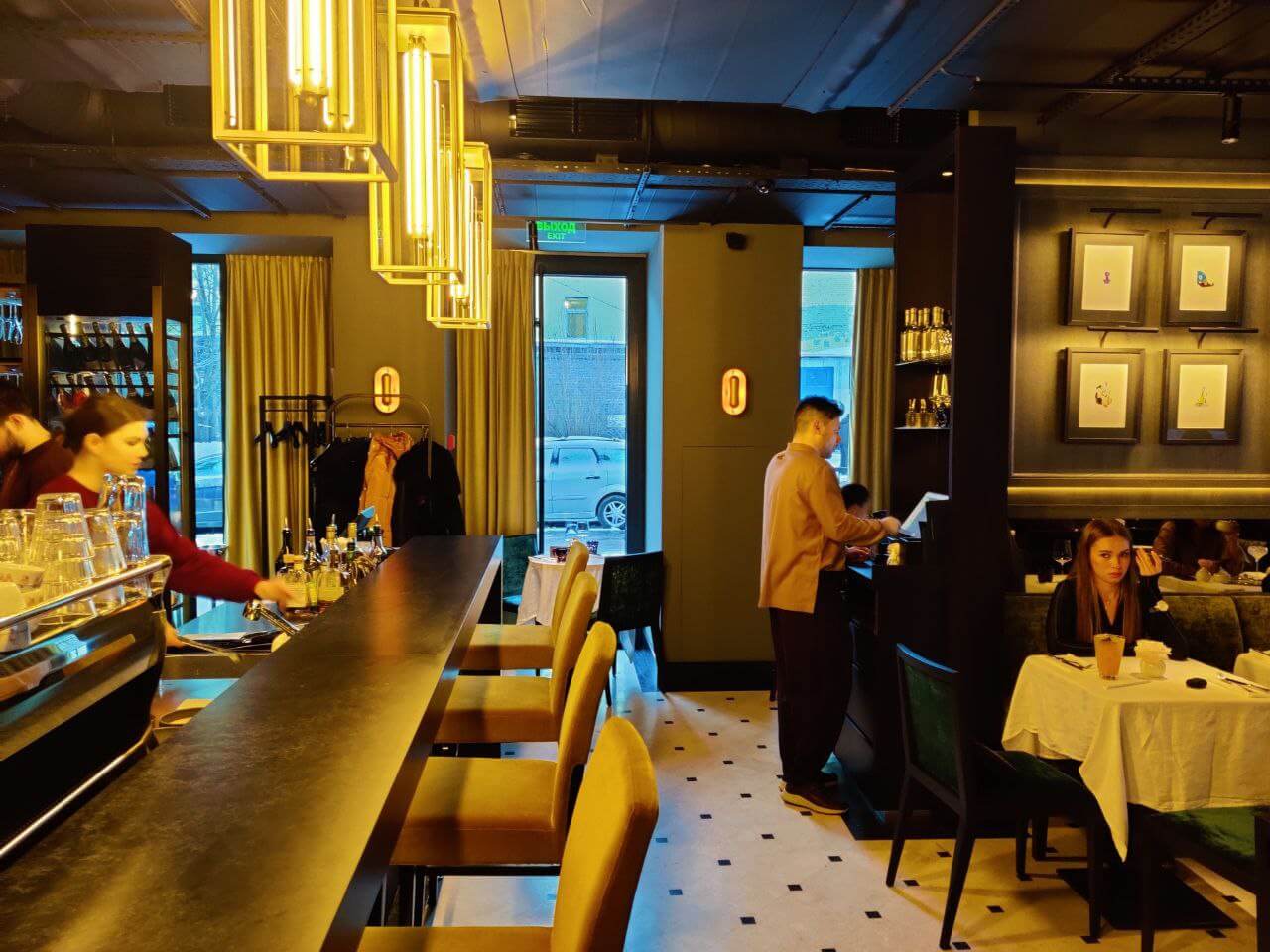 Многие уже отметили главный недостаток заведения: слишком маленькое расстояние между столиками. Действительно, в основном зале вести секретные переговоры я бы тоже не рекомендовал. Если в разгар рабочего дня некоторые столики пустовали, то с наступлением вечера количество желающих отметиться в новом заведении стремительно росло. Что интересно, публика довольно разношерстная: от стильных девочек-подростков до солидных мужчин. Пространство украшено произведениями современного искусства, видимо, тренд на рестораны-галереи еще не прошел.