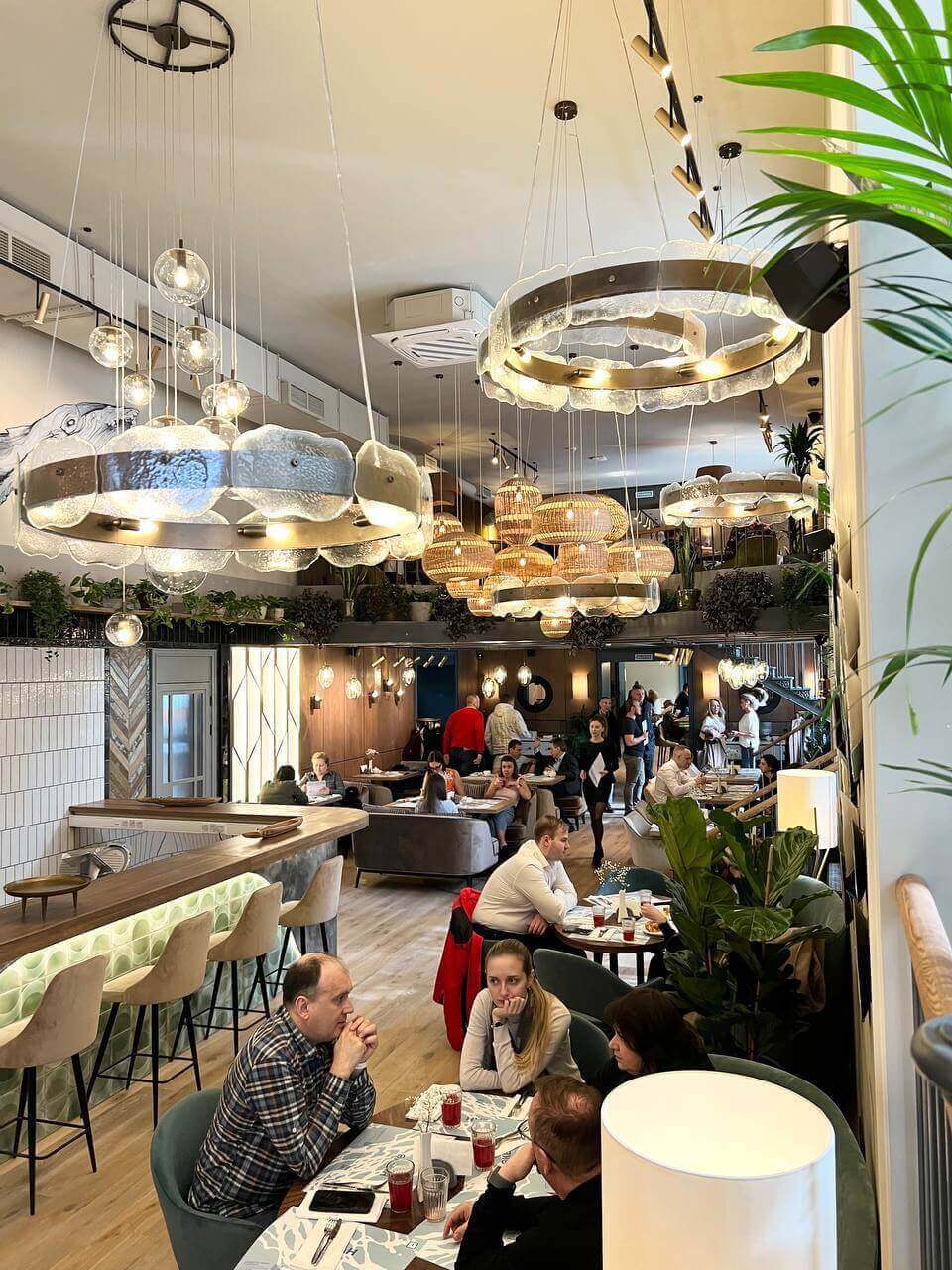 Пространство нового ресторана (к слову, самого масштабного из всех) притягивает своими большими панорамными окнами. Здесь велики шансы найти столик даже без брони, но лучше все-таки позаботиться об этом заранее.