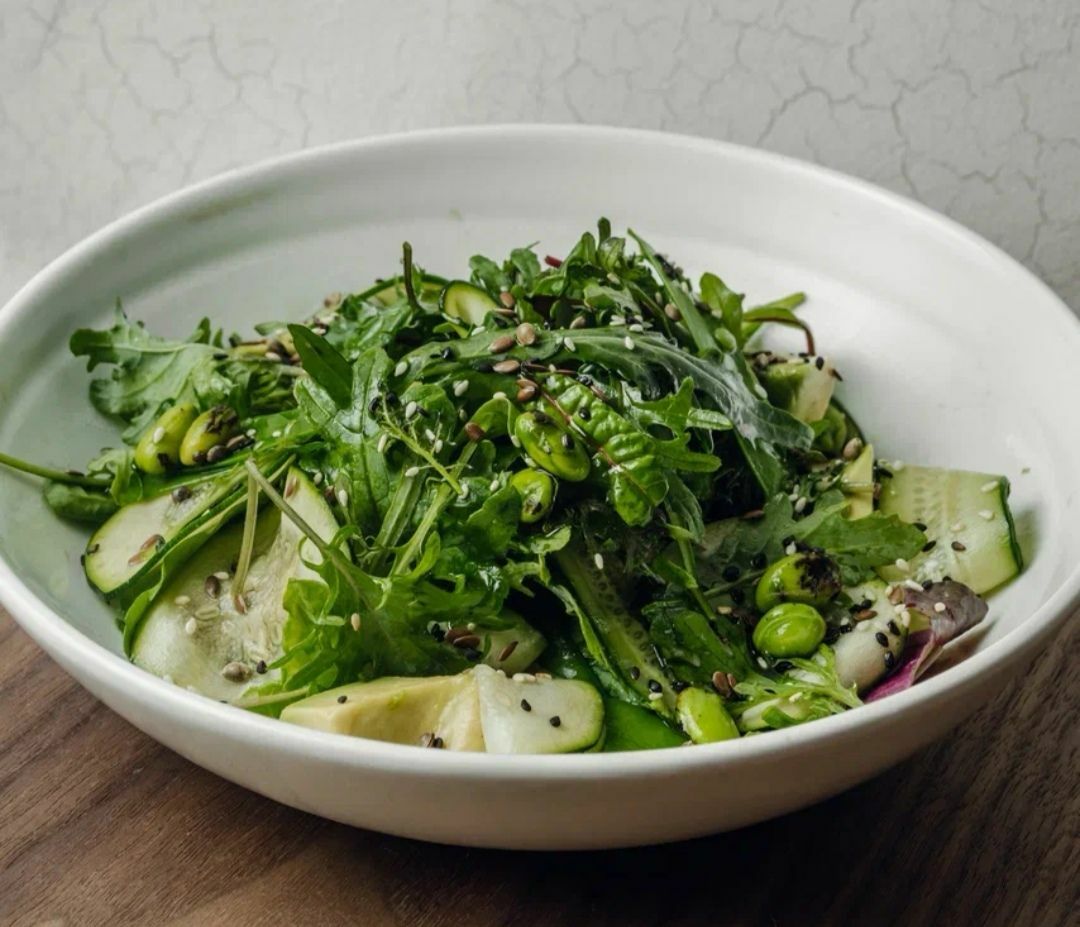 Зеленый салат (820₽) нас просто покорил! Звезда блюда — заправка в тайском стиле с шисо соусом и все тем же шикарным авокадо, оду которому мы уже пропели во время дегустации брускетты. Рекомендуем от всей души!
