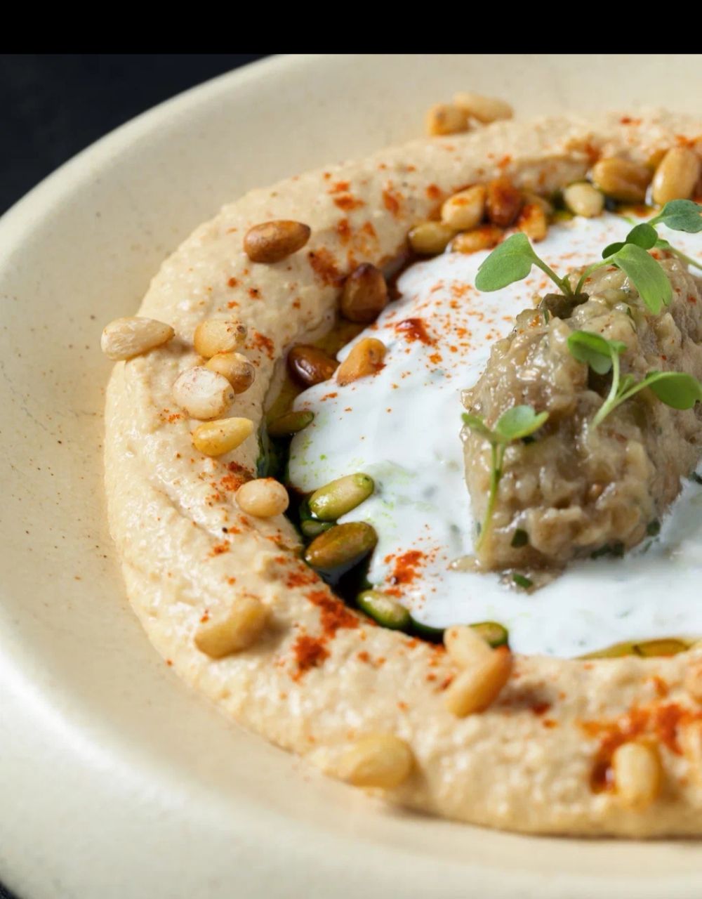 Хумус с печеным баклажаном (650₽) подается с лепешкой. Баклажан здесь органичен, в блюде есть кедровые орешки, что создает интересное сочетание.