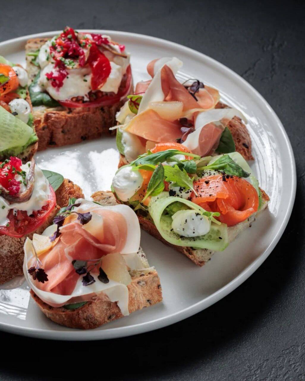 Далее были 3 вида брускетт с различными начинками: Брускетта с пармой (630₽), Брускетта со слабосоленым лососем (860₽), Брускетта со страчателлой и анчоусами (620₽). Каждая по своему хороша, но нам больше всего пришлась по вкусу с лососем, в многом за счет фантастически мягкого и нежного авокадо. Единственный минус — подгоревшие краешки хлеба. Ведь когда вкусно — хочется съесть всё до последней крошки.