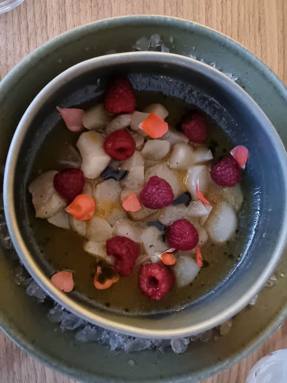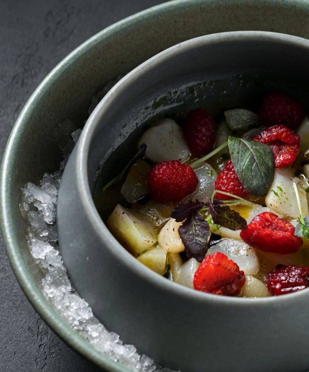 Знакомство с кухней мы начали с закусок — Крудо из гребешка (920₽). Легкое ароматное блюдо, в котором гармонично сочетаются гребешки, малина и имбирно-медовый дрессинг, приятные цитрусовые нотки.
