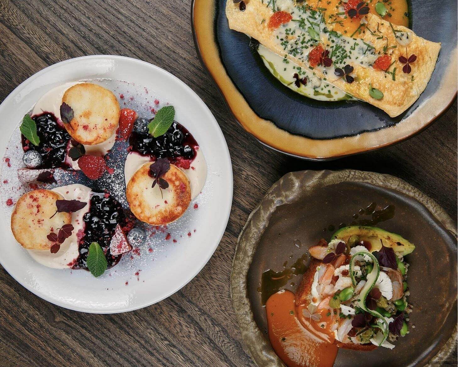 бриошь с креветкой, козьей рикоттой и авокадо; омлет с сыром бри, соусами беарнез и блю чиз и икрой форели; сырники рисовые с вареньем, сметаной и ягодами.