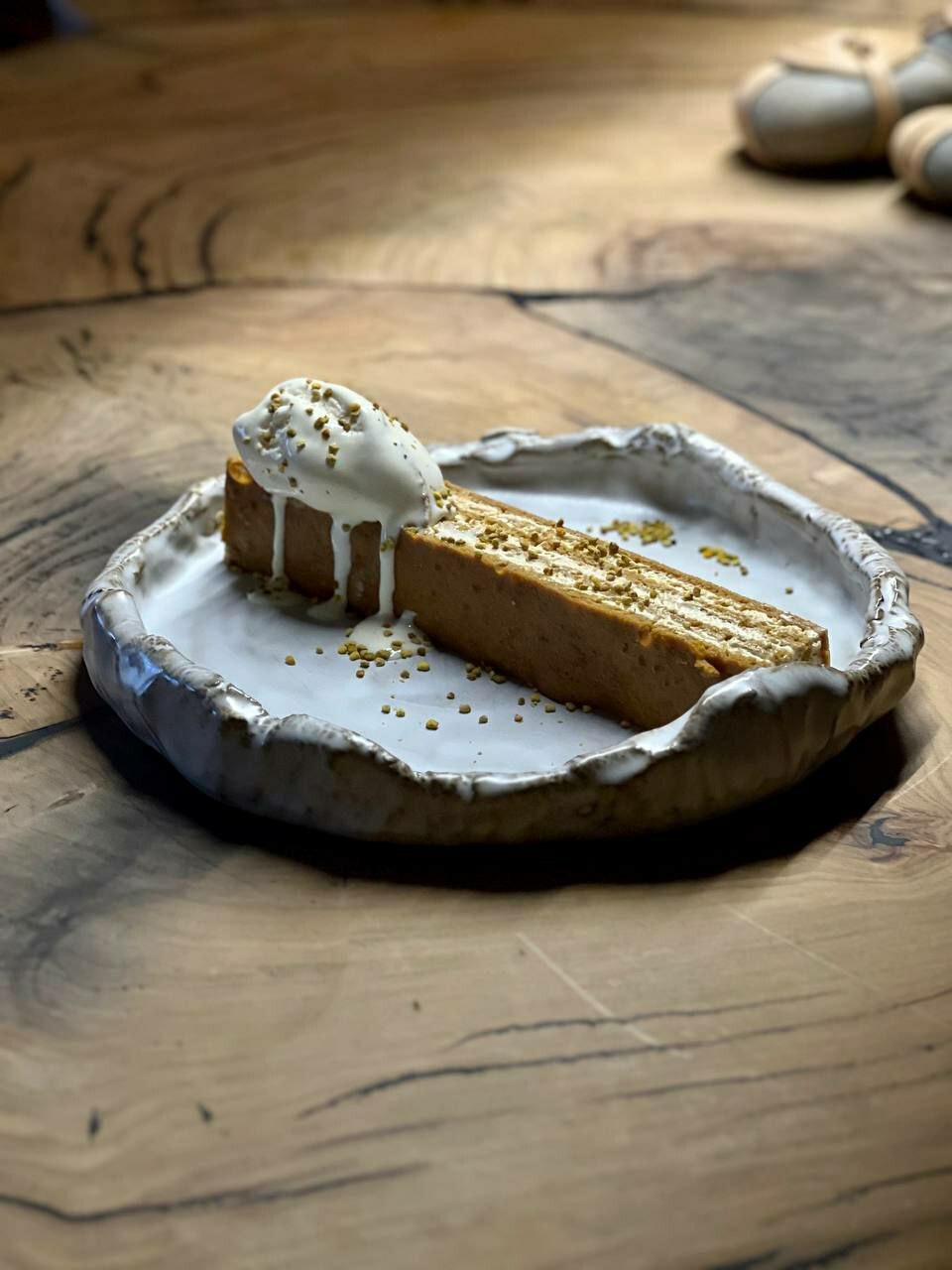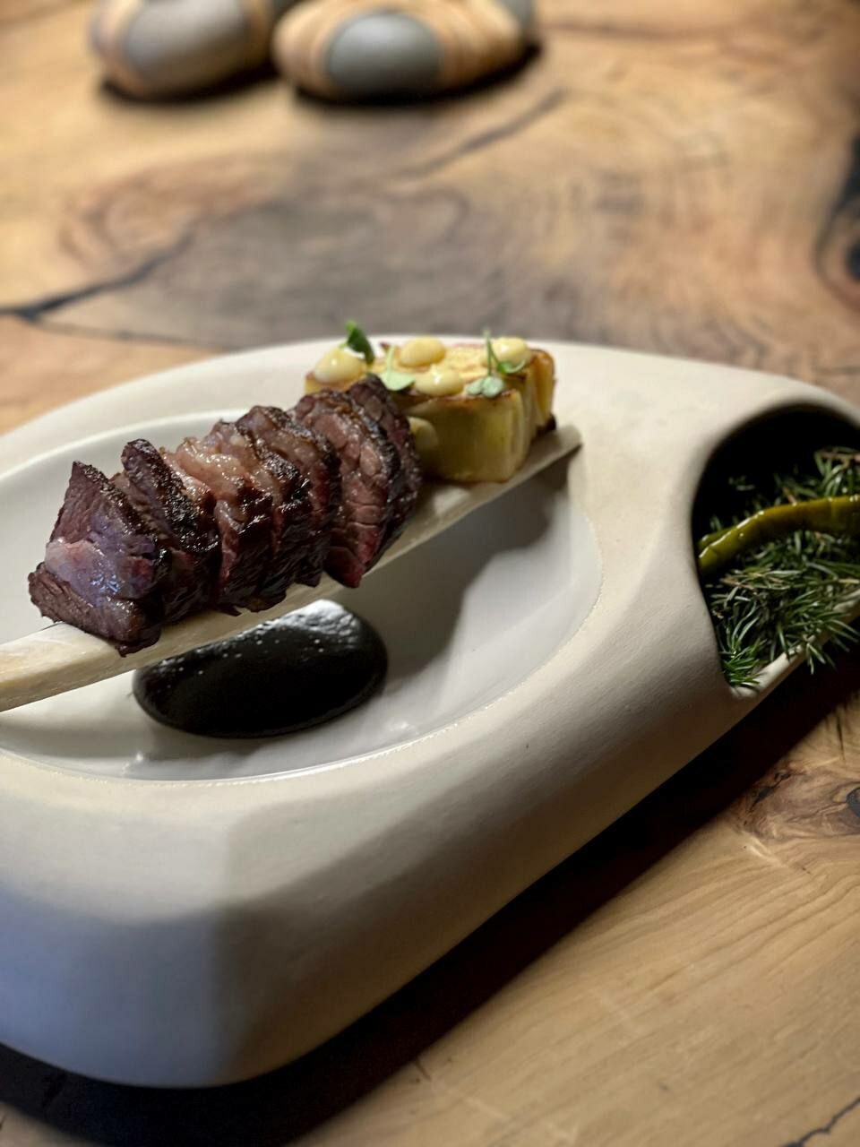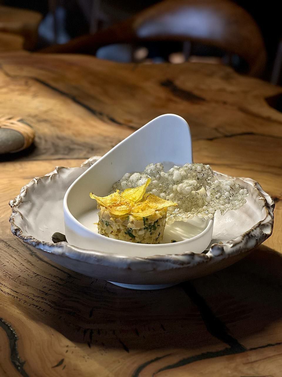 Алхимия с гидролатами, тартар на «бивне мамонта» и уборная в таинственной чаще. Все это про новый ресторан Айна, открывшийся в марте на Остоженке.В основе концепции ресторана лежит авторская интерпретация на тему «современная кухня народов России». Отсюда, видимо, очень богатая география продуктов: от краба и устриц до кавказских трав. Трапеза здесь начинается со стакана талой воды с добавлением одного из трех гидролатов. Эта «фишка» ресторана придется многим по вкусу.Из стартеров советуем попробовать риет из рапана/картофель/желток (590₽). Вкус необычный, яркий, с легким флером Черноморского лета. А вот ежи и устрицы в местном исполнении совсем не впечатлили, особенно учитывая их стоимость (690₽).В разделе горячих закусок обратите внимание на чебуреки с крабом/томаты/краснодарская аджика (990₽). Несмотря на отличное тонкое тесто, к начинке и сладкой аджике вопросы остались. Блюдо удобно заказывать на компанию (в порции 3 штучки). Любителям овощей в необычной интерпретации можно заказать обожженную капусту / крыжовник / горелые сливки (690₽). Очень любопытное и неординарное сочетание ингредиентов.Из основных блюд приглянулось говяжье ребро/квасной BBQ/жареный картофель (1290₽). Красивая подача, да и комбинация оригинального соуса, правильного гарнира и качественного мяса вряд ли кого-то расстроит.Если останется место для десерта, побалуйте себя безукоризненным медовиком из гречишного меда с мороженым (790₽). Порция объемная, берите на компанию. Закончить трапезу советуем не традиционным эспрессо, а какао со вкусом Бородинского хлеба. Чтобы максимально проникнуться духом современной русской кухни.Кстати, обязательно пообщайтесь с сомелье. У винной карты своя концепция и представлено много интересных российских позиций. А еще, буквально на днях, на -1 этаже по выходным заработал бар «Инта» с необычной коктейльной картой.Для полной картины посмотрите наш короткий видеоролик.