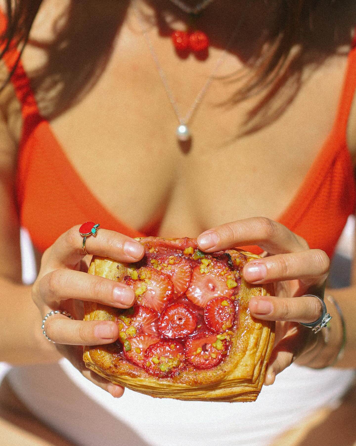 слойка с ревенем, фисташковым франжипаном и клубникой;
