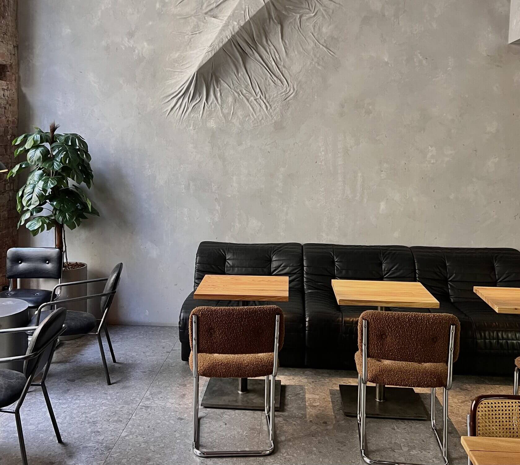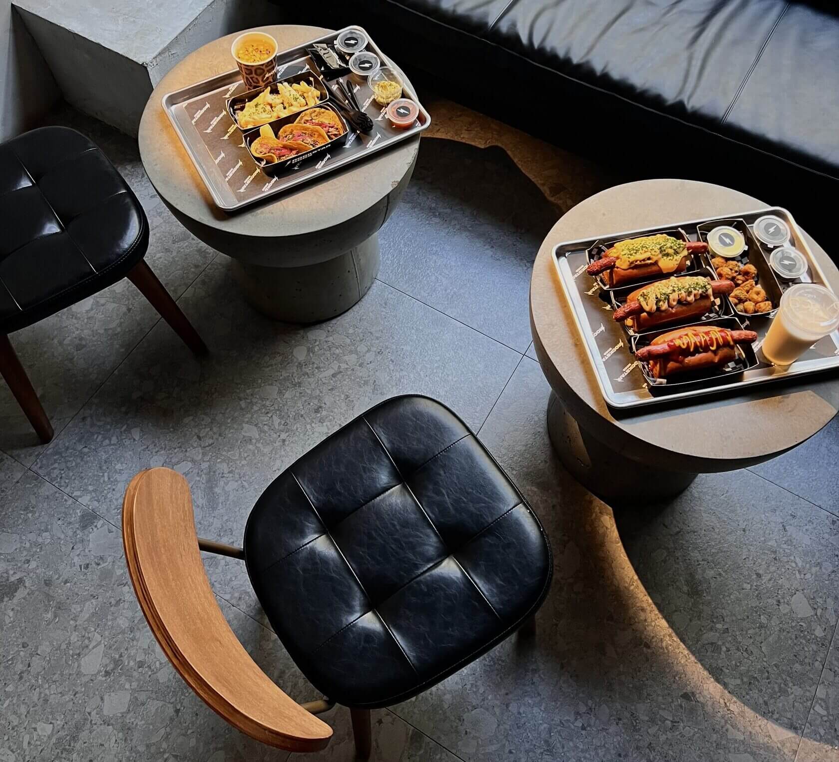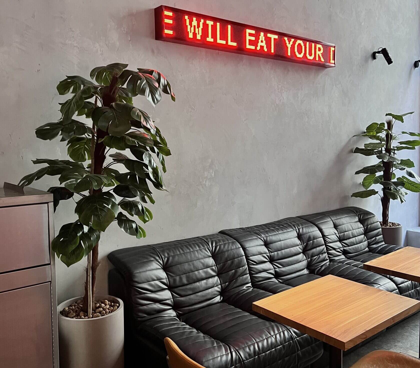 Кожаные диваны, бегущие надписи по типу «Slow live — fast food» по серым бетонным стенам, каменные столешницы и немного зелени. В центре зала — яркая пятнистая стойка, за которой и принимают заказы на желанные хот-доги.