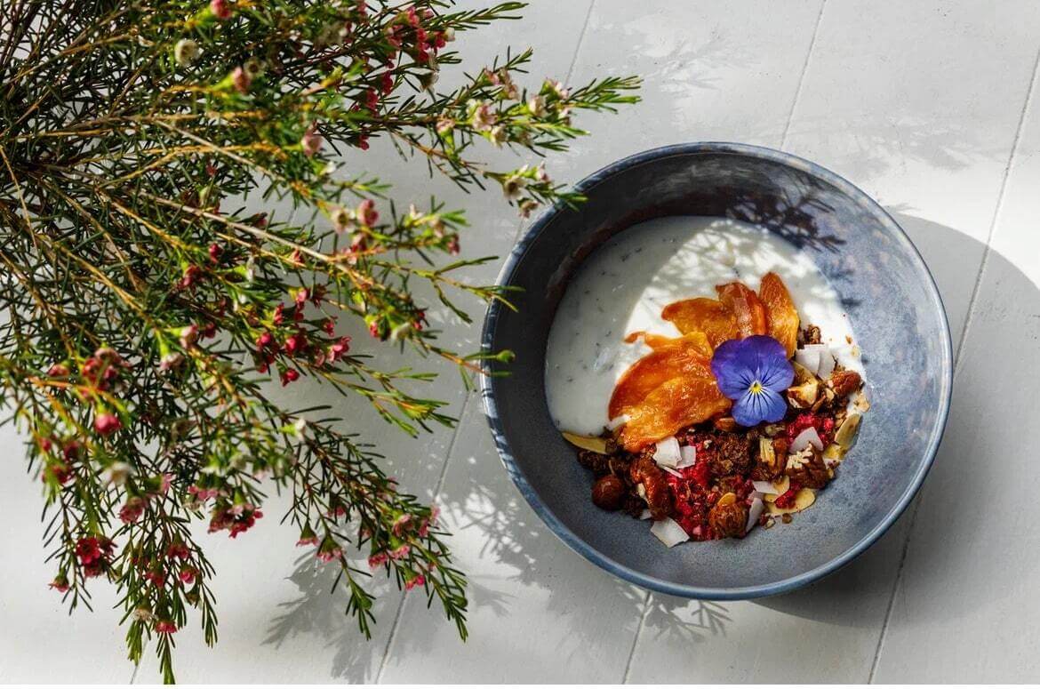 гранола с карамелизированым персиком и йогуртом с мятой (680₽) из меню обновлённых завтраков