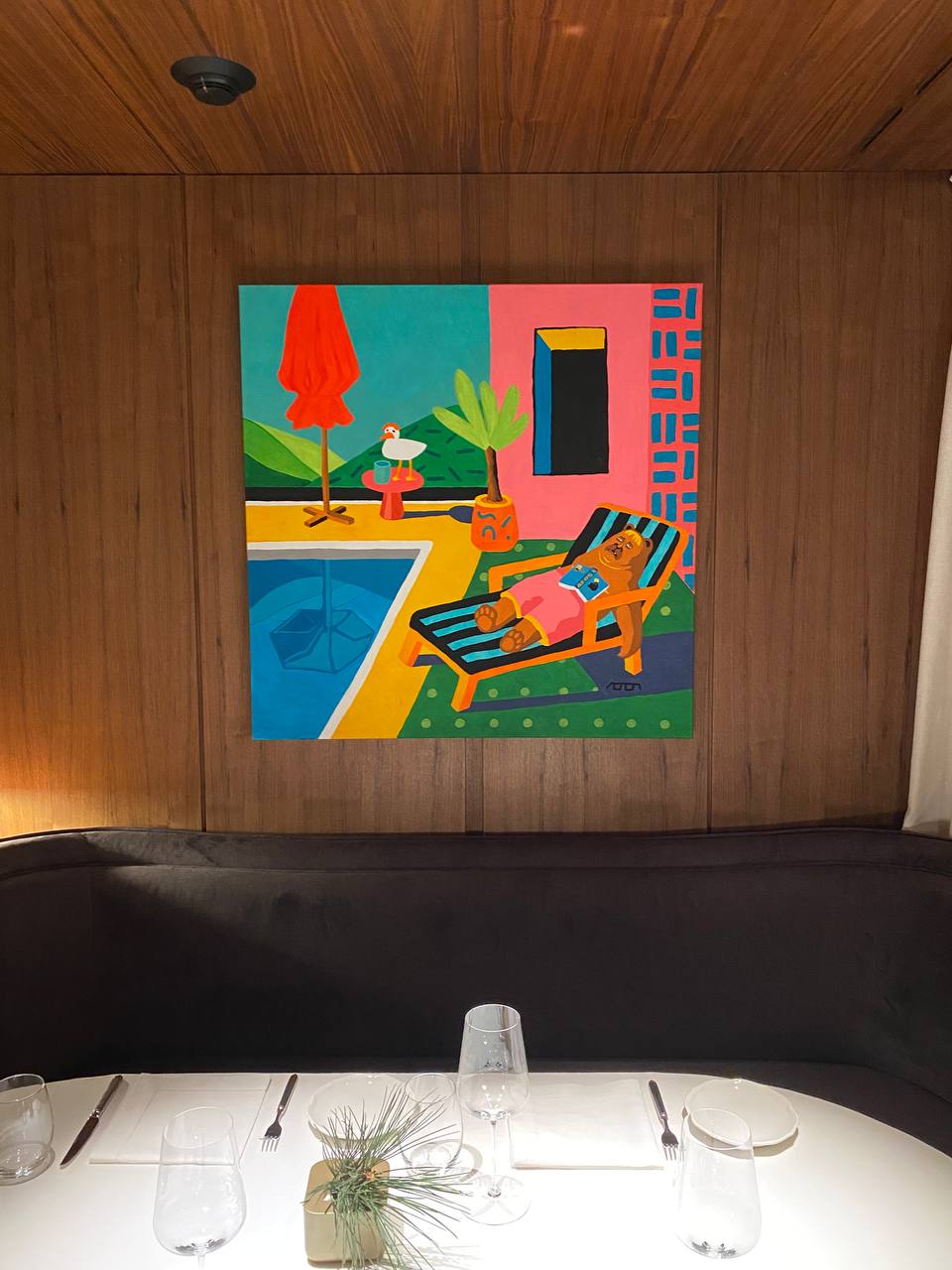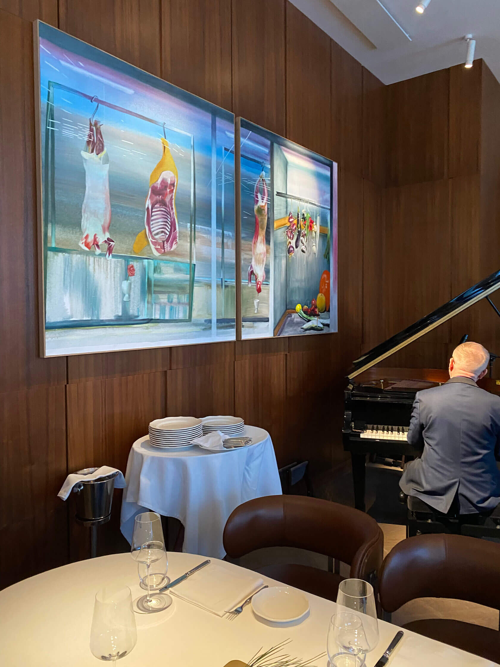 Интерьер киношный, но это не просто декорации, а невероятный стиль, за который отвечают сестры Сундуковы. Два этажа, правильные формы, обилие дерева, огромные окна в пол, за которыми должен быть Лондон, а не Москва. Камерные кабинеты и отдельные залы на втором этаже с видом на приятную суету первого этажа. Официанты в белых кителях и перчатках добавляют происходящему в зале немного кинематографичности, а индивидуальные салфетки от фабрики «Крестецкая строчка» – это десять из десяти (сердце редактора растаяло от умиления). Современное искусство на стенах, рояль, на котором, кстати, играют ежедневно, добавляют правильный вайб происходящему и даже слегка разряжают обстановку fine-dining.